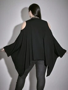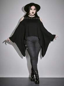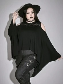 Goth Gothic Style Bat Wing Asymmetrical Hem Metal Brooch Decor Hollow Mesh Design Plus Size Black T-Shirt, Autumn/Winter Plus Size Women Black Top
