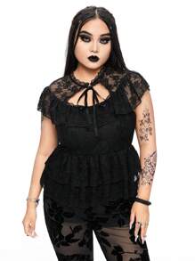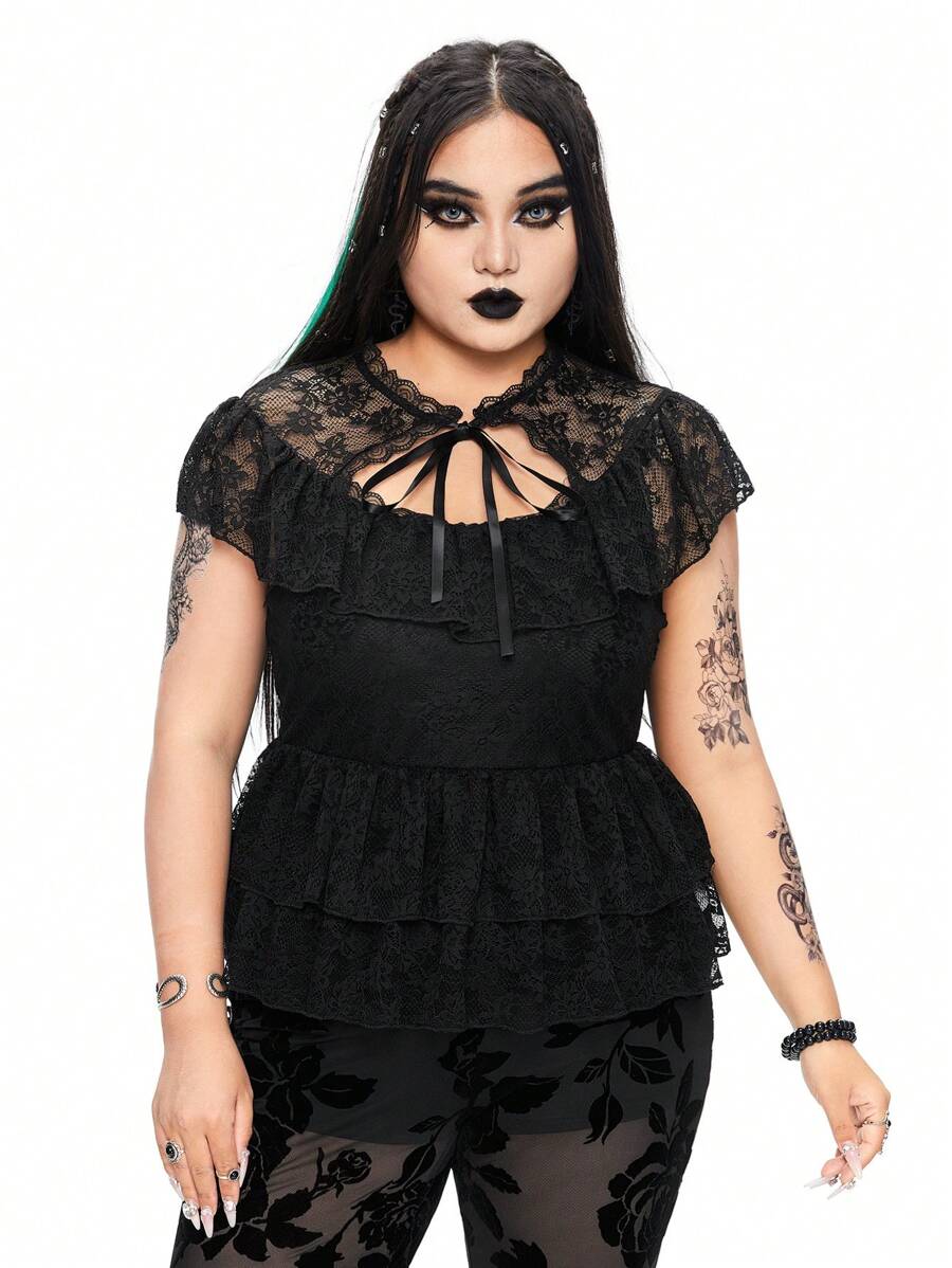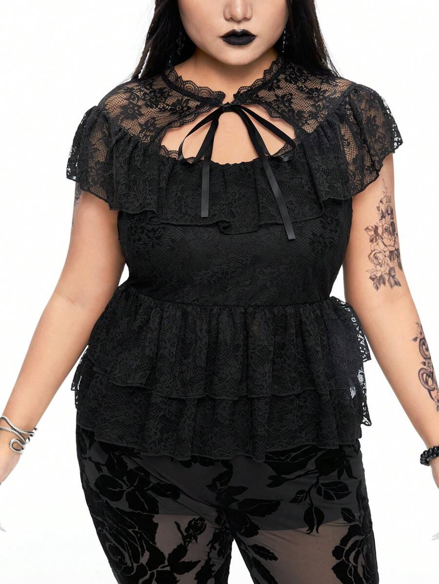 Gothic Style Hollowed Collar A-Line Lace Top With Cinched Waist And Ruffle Trim, Plus Size For Women