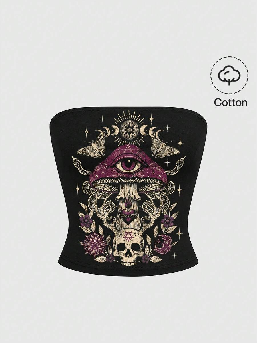 Gothic Style Mushroom Eye, Dark Horror Sun Moon Star Butterfly Bat Floral Black Tube Top For Women