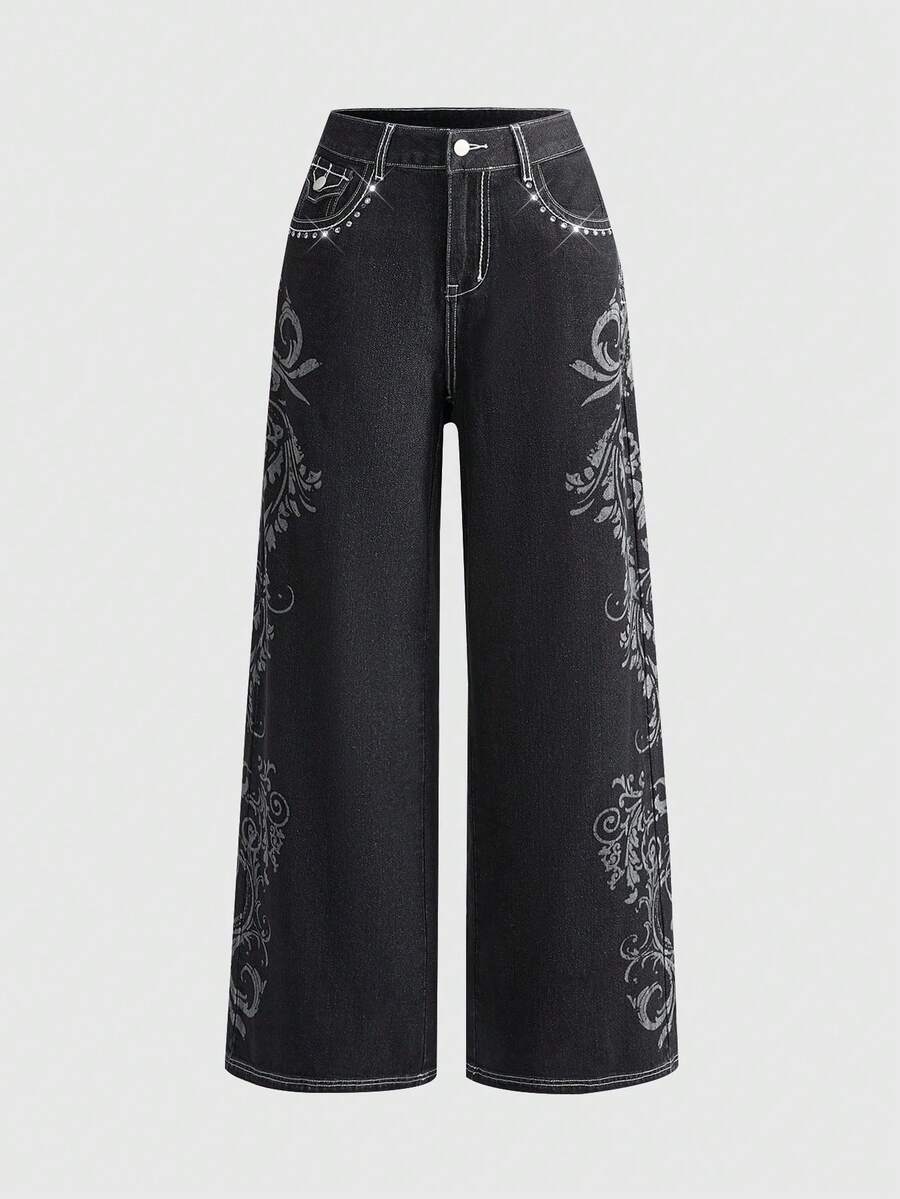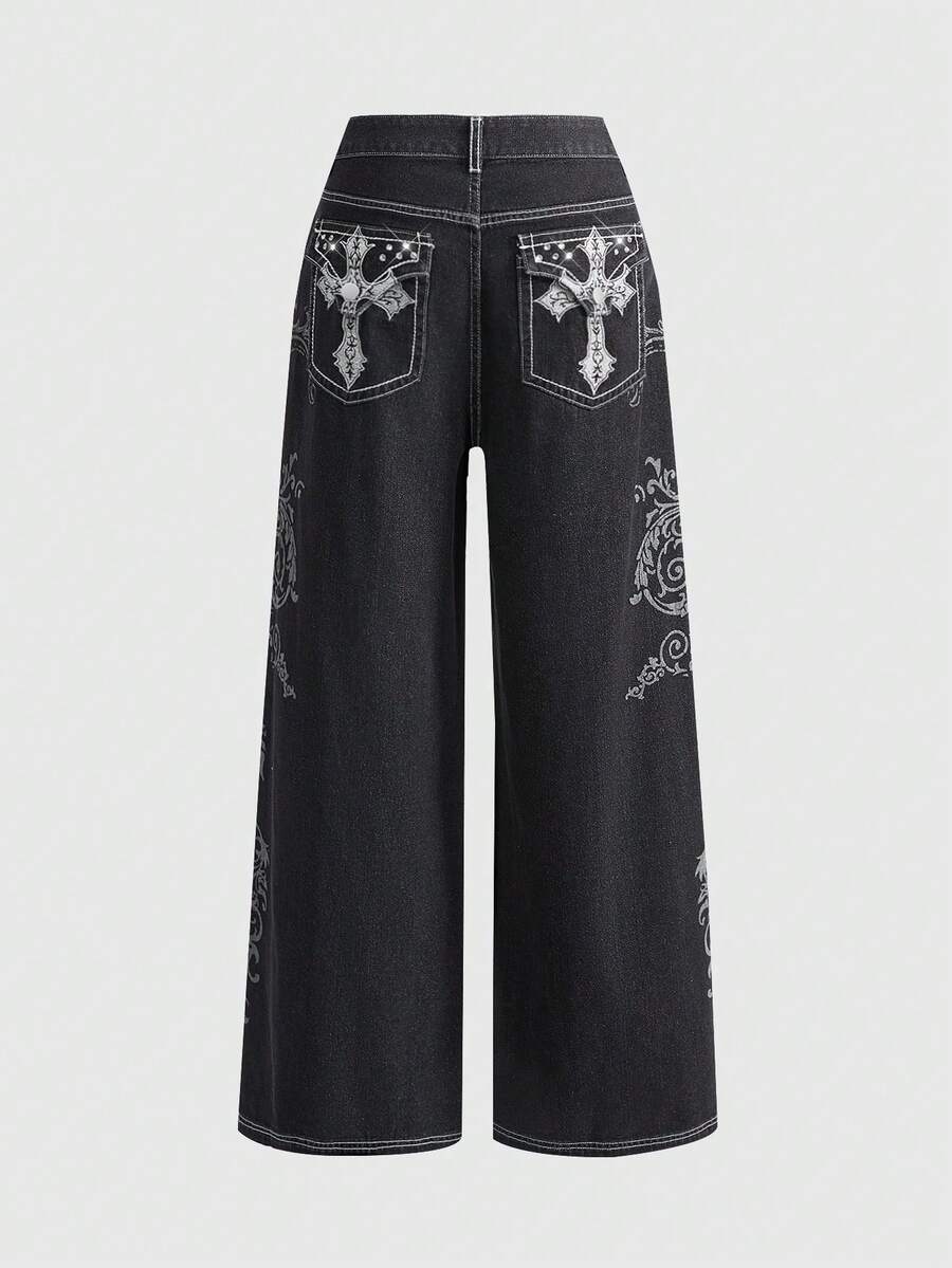 Grunge Punk Gothic Vintage Cross & Vine Print Loose Wide-Leg Women Jeans