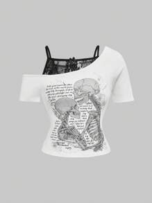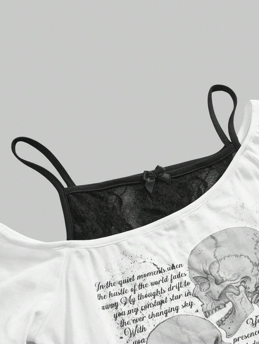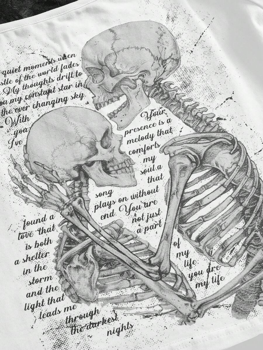 Gothic Vintage Y2K Skeleton Hug Print Lace Patchwork Tight Short Sleeve T-Shirt For Women