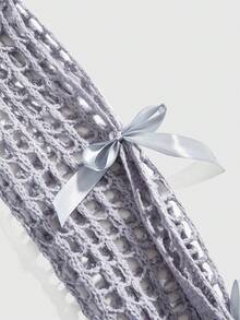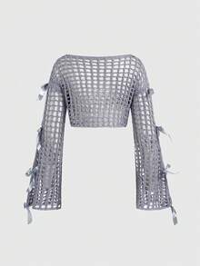 Gray Handmade Crochet Hollow Out Long Sleeve Cover Up, Fairycore Butterfly Decor Niche Sexy Style Cropped Mesh Knit Top