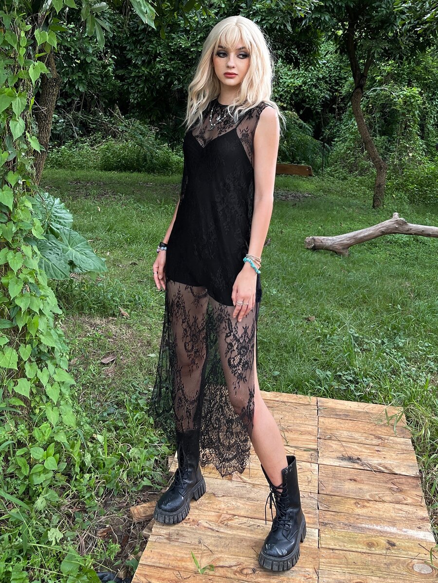 Grunge Floral Pattern Split Thigh Sheer Lace Dress Without Romper and Belt