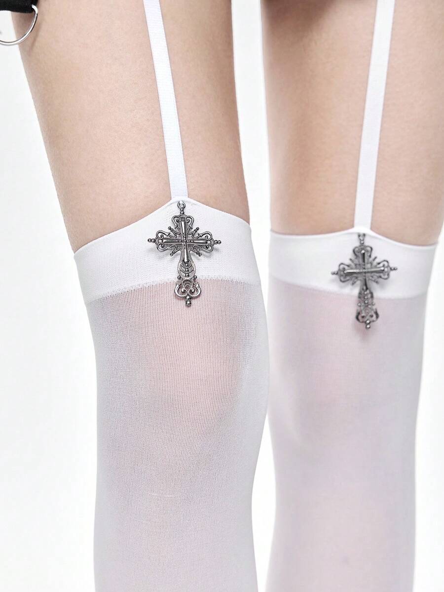 Grunge Punk 1 Bimetal Pendant Pendant Socks + 1 Pair Of Black And White Striped Socks, Y2K White Solid Color Tights Socks Combination, Elastic And Thin Pantyhose, Fashion Combination Set.
