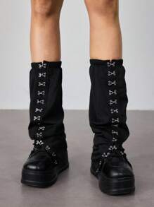 Grunge Punk 1 Pair Baddie Punk Style Solid Black Leg Warmers, Y2K Minimalist Double-Buckle Ruched Knee High Leg Warmers, Fashionable Slimming Fit For Daily, Holidays And Party Outfits
