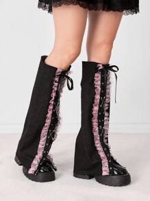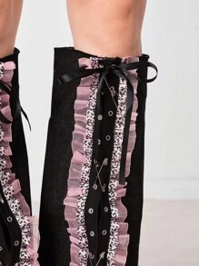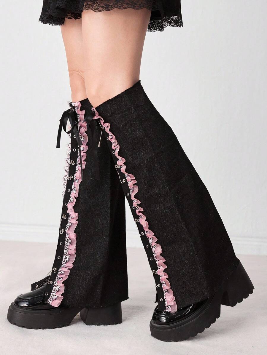 Grunge Punk 1 Pair Punk Rock Leopard Print Safety Pin Decor Leg Warmers, Y2K Style Lace-Up Lace Trim Solid Black Knee High Leg Warmers, Personalized Slimming, Suitable For Daily, Festivals And Parties