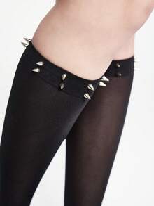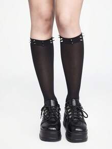Grunge Punk 1 Pair Punk Style Studded Calf Socks, Y2K Minimalist Black Solid Color JK Mid-Calf Socks, Ultra-Thin Elastic Sheer Tights