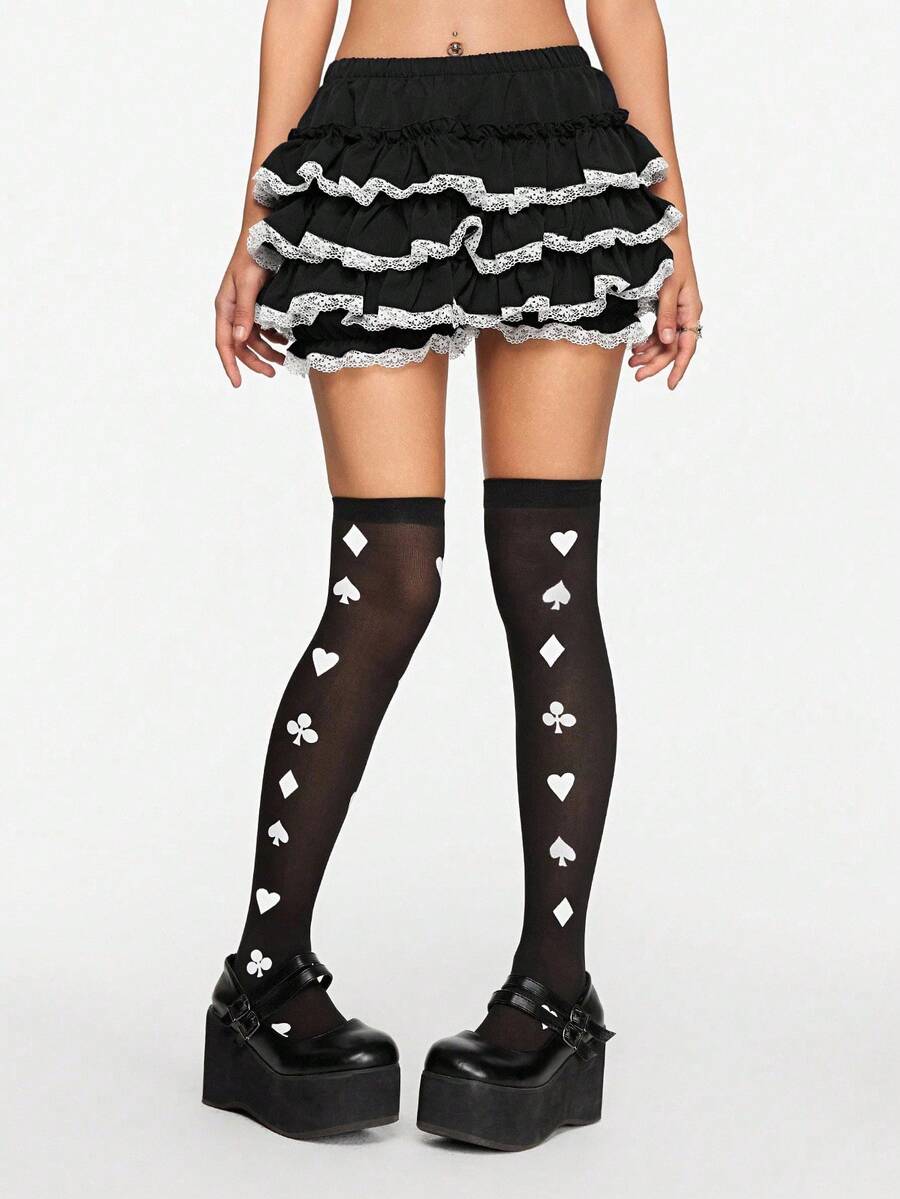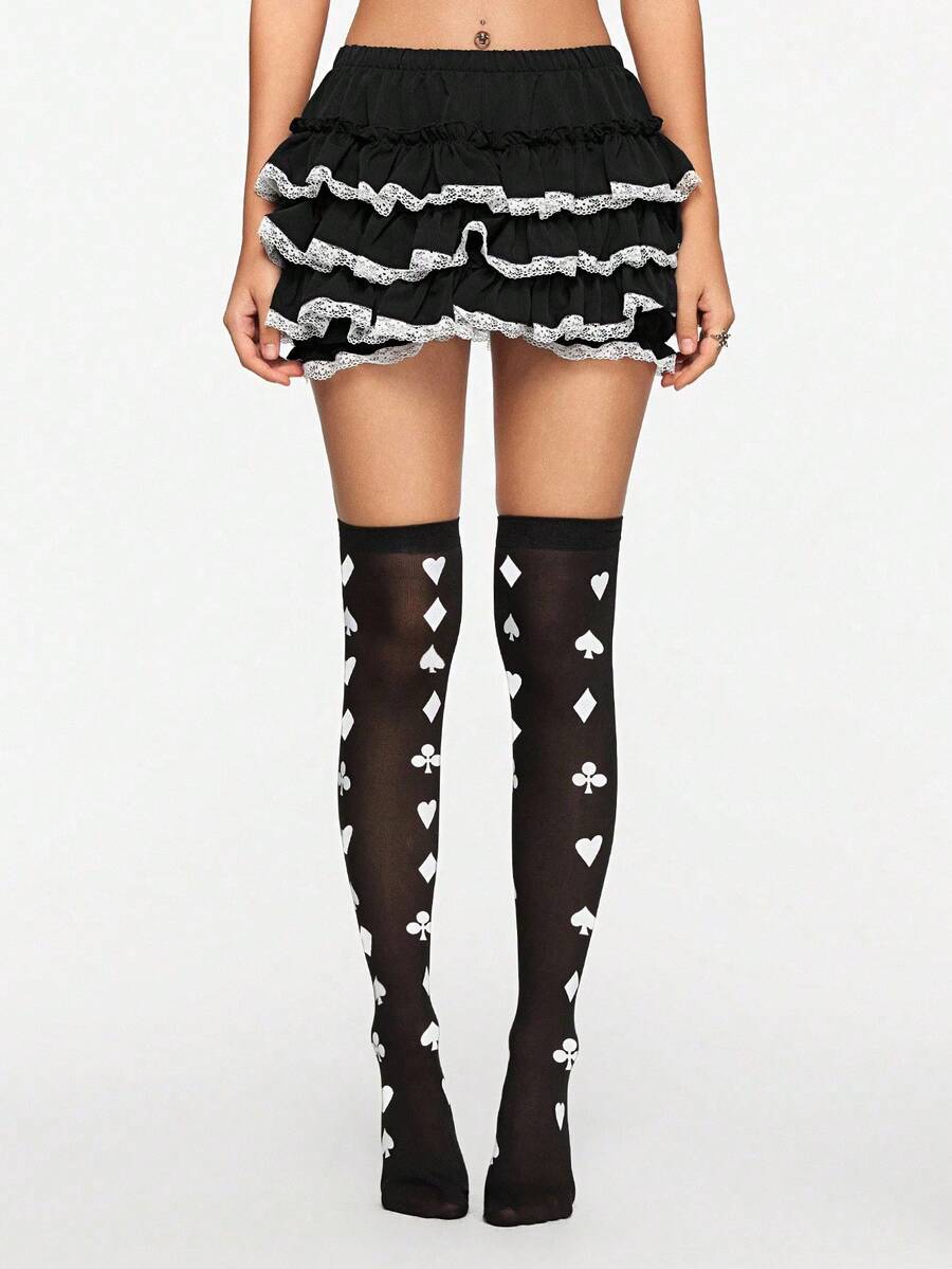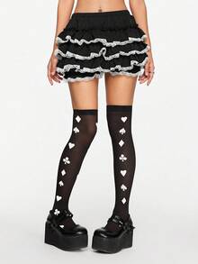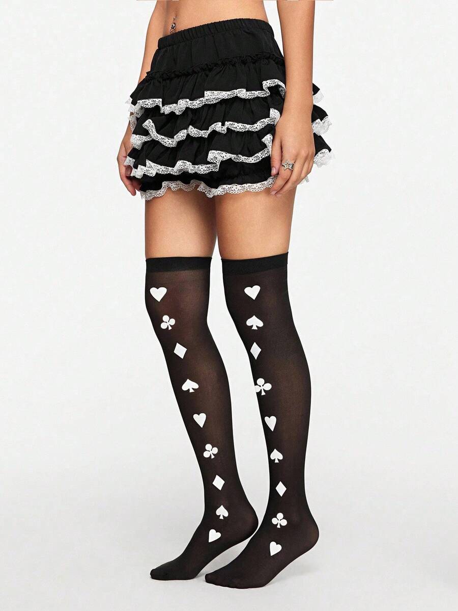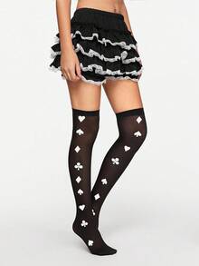 Grunge Punk 1 Pair Sexy Halloween Playing Card Fishnet Thigh High Socks, Cute Geometric Pattern Elastic Sheer Stockings, Fashionable Layering Socks For Daily Wear And Parties