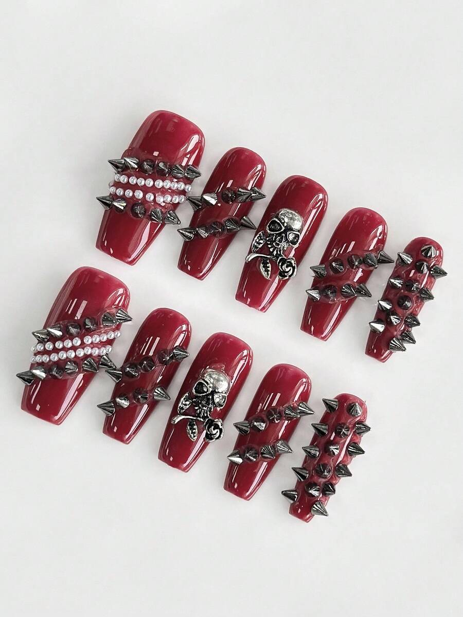 Grunge Punk 10pcs Punk/Edgy Skeleton Head Rivet Handpainted High Quality False Nails + 3 Sheets Double Sided Adhesive, Reusable Medium/Long Coffin Shape Fake Nails, Y2K Pearl Red Solid Color Handpainted Nail Stickers, Suitable For Festivals, Parties, Dancing And Daily Wear, Halloween