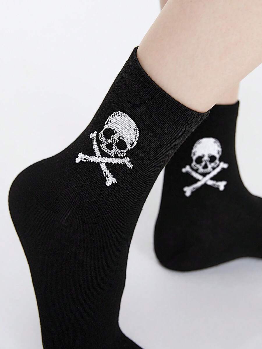 Grunge Punk 1pair Women's White Skull Head Black Mid-Calf Socks, All Seasons