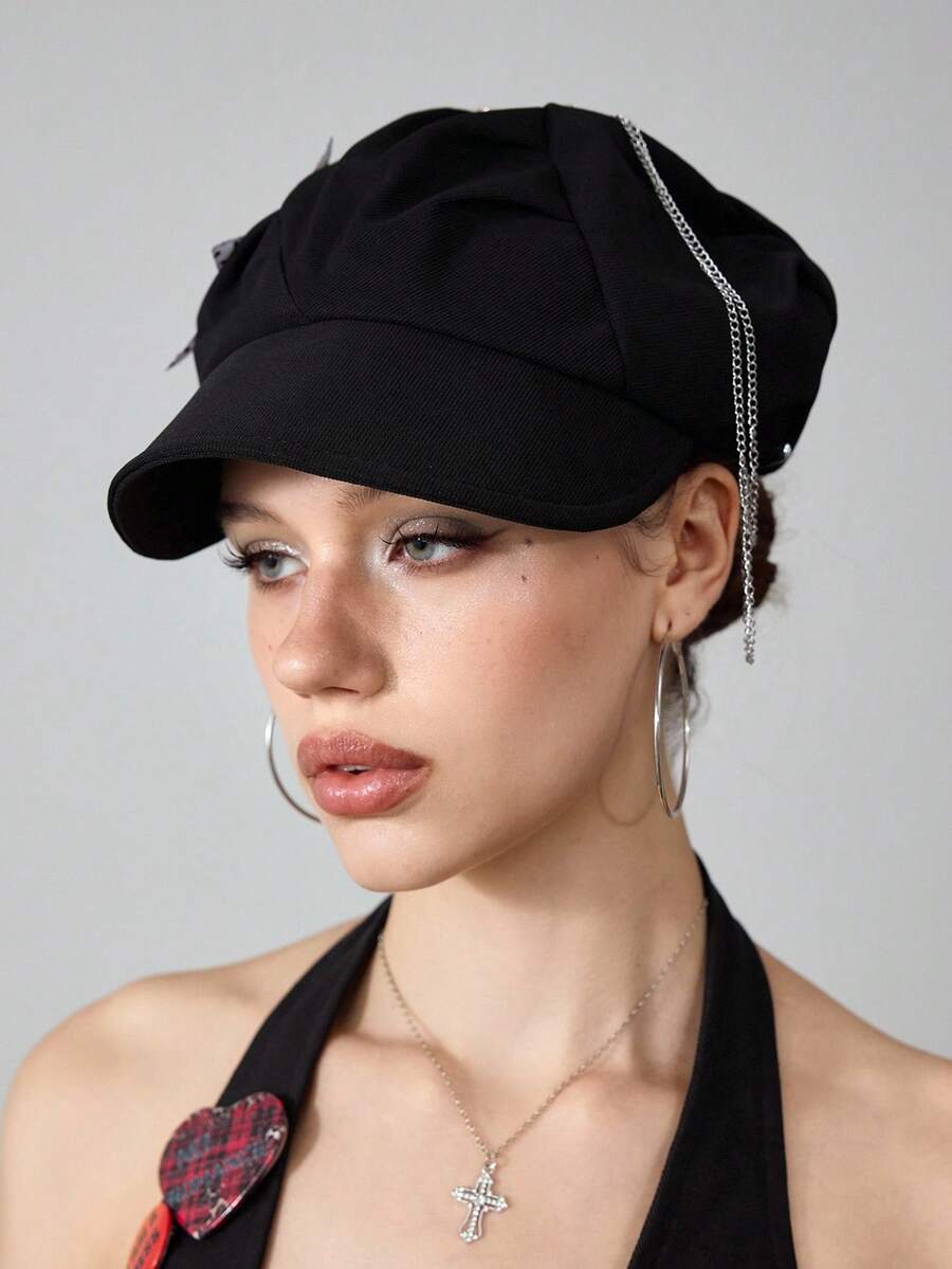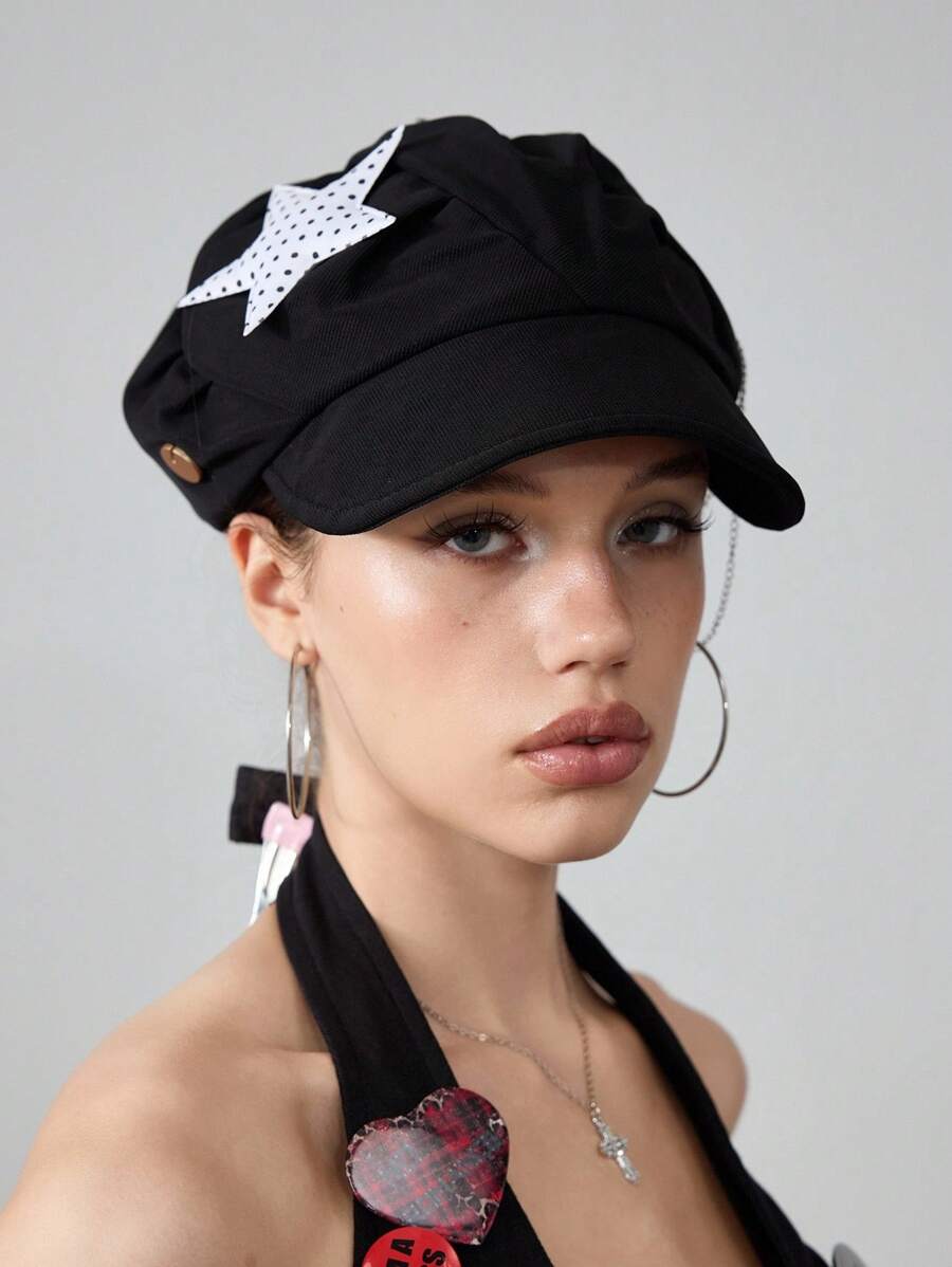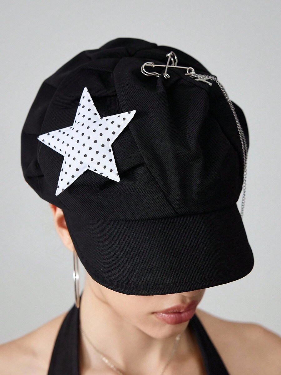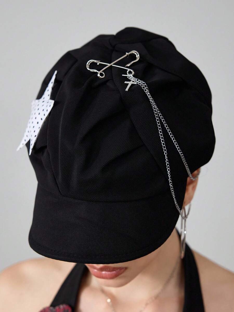 Grunge Punk 1pc Black Y2K Punk Retro Polka Dot Star Millennium Streetwear Vibe Metal Clip Chained Fashion Beret Hat For Women, Suitable For Casual, Travel And More
