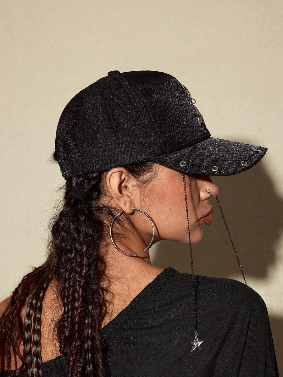 Grunge Punk 1pc Black Y2K Punk Style Metal Chain Star Eyelet Decoration Simple Baseball Cap, Suitable For Sports, Casual Outing, Daily Commute