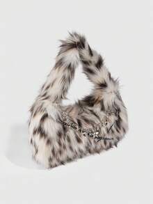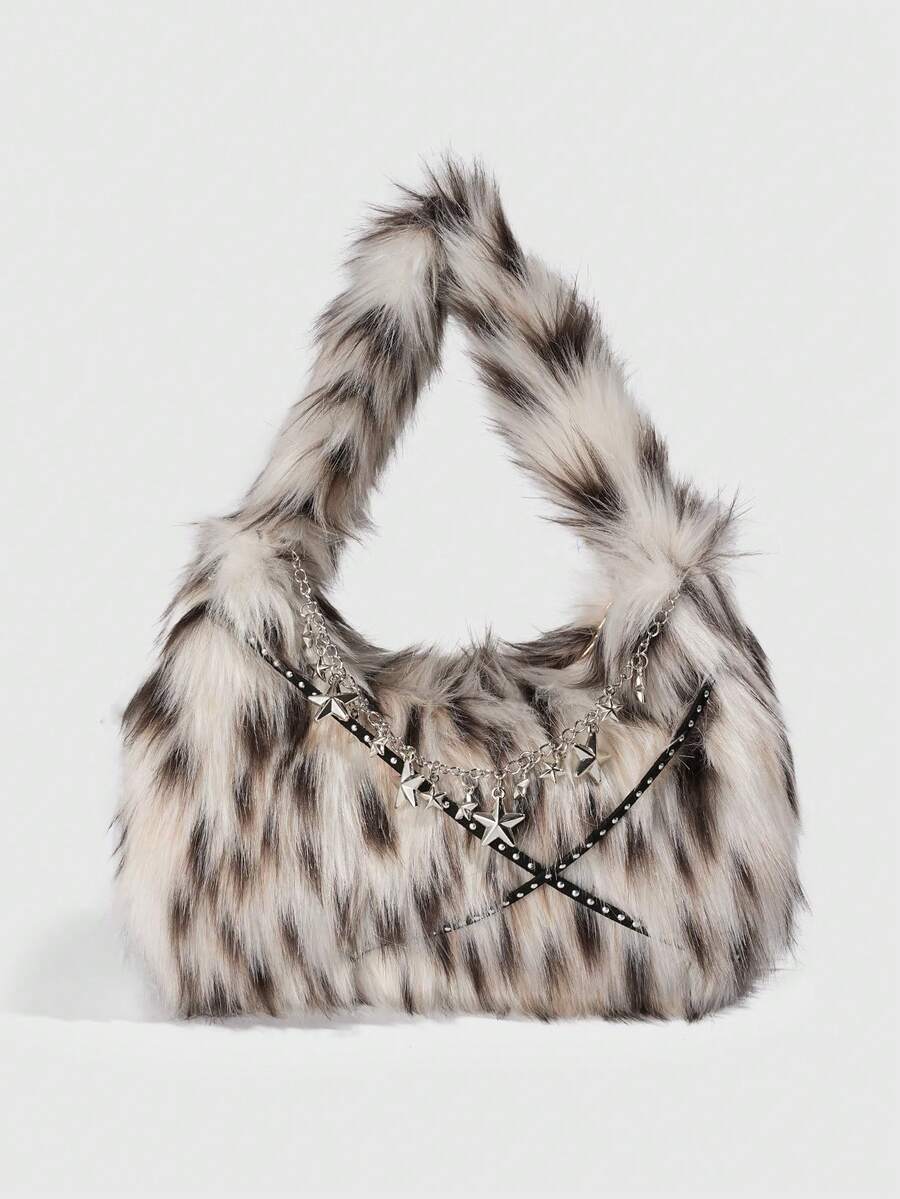 Grunge Punk 1pc Chic White Leopard Print Star Chain Decorated Handbag, A Winter And Autumn Plush Bag For The Armpit Area, Suitable For Pairing With A Clutch Bag At A Hot Girl Party Or Gathering