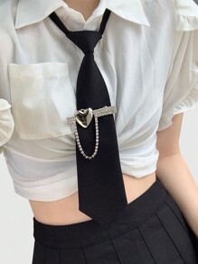 Grunge Punk 1pc Metal Heart Rhinestone Decor Black Asymmetric Bowknot, Cute School Girl Look Uniform Shirt Tie For Women