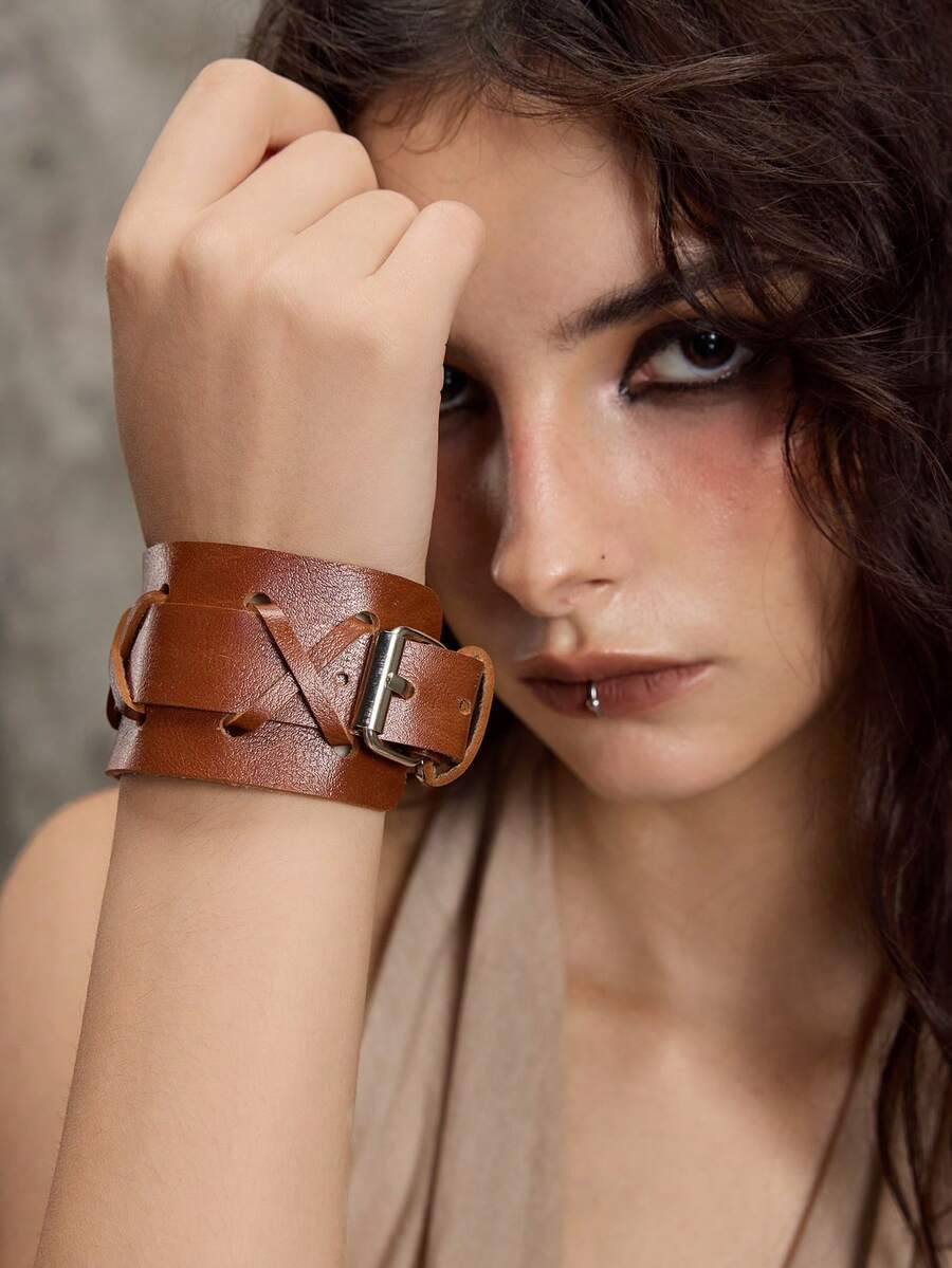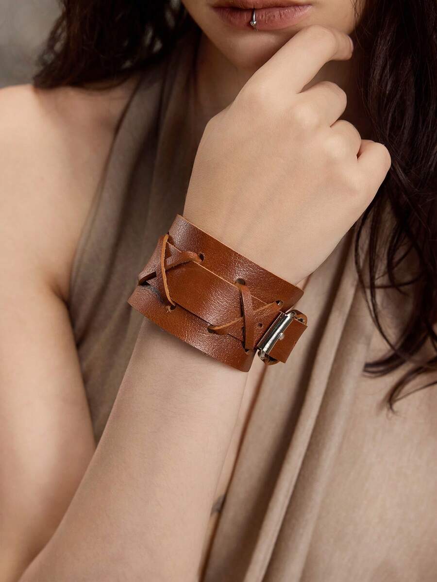Grunge Punk 1pc Retro Chic Geometric Pattern Bracelet, Y2K Distressed Style High Quality PU Leather Adjustable Wristband, Niche Design