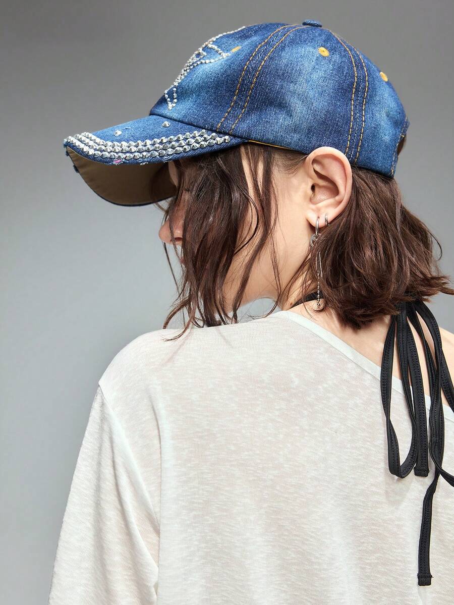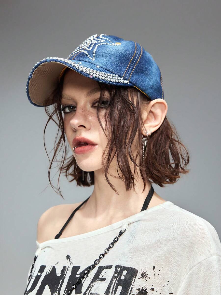 Grunge Punk 1pc Rhinestone Embellished Baseball Cap, Y2K Style Star Pattern Design, Casual Personalized Snapback Hat, Daily Wear