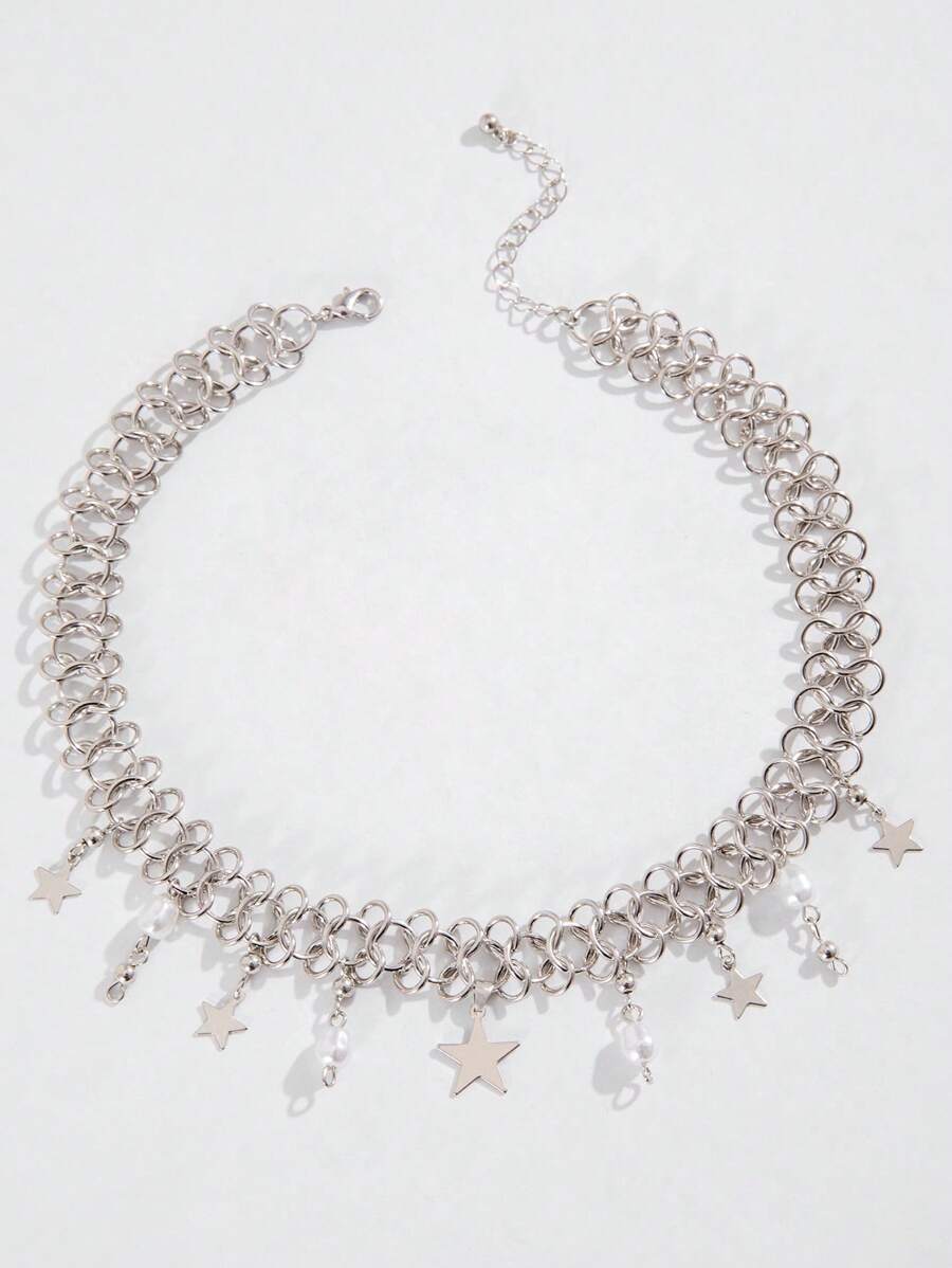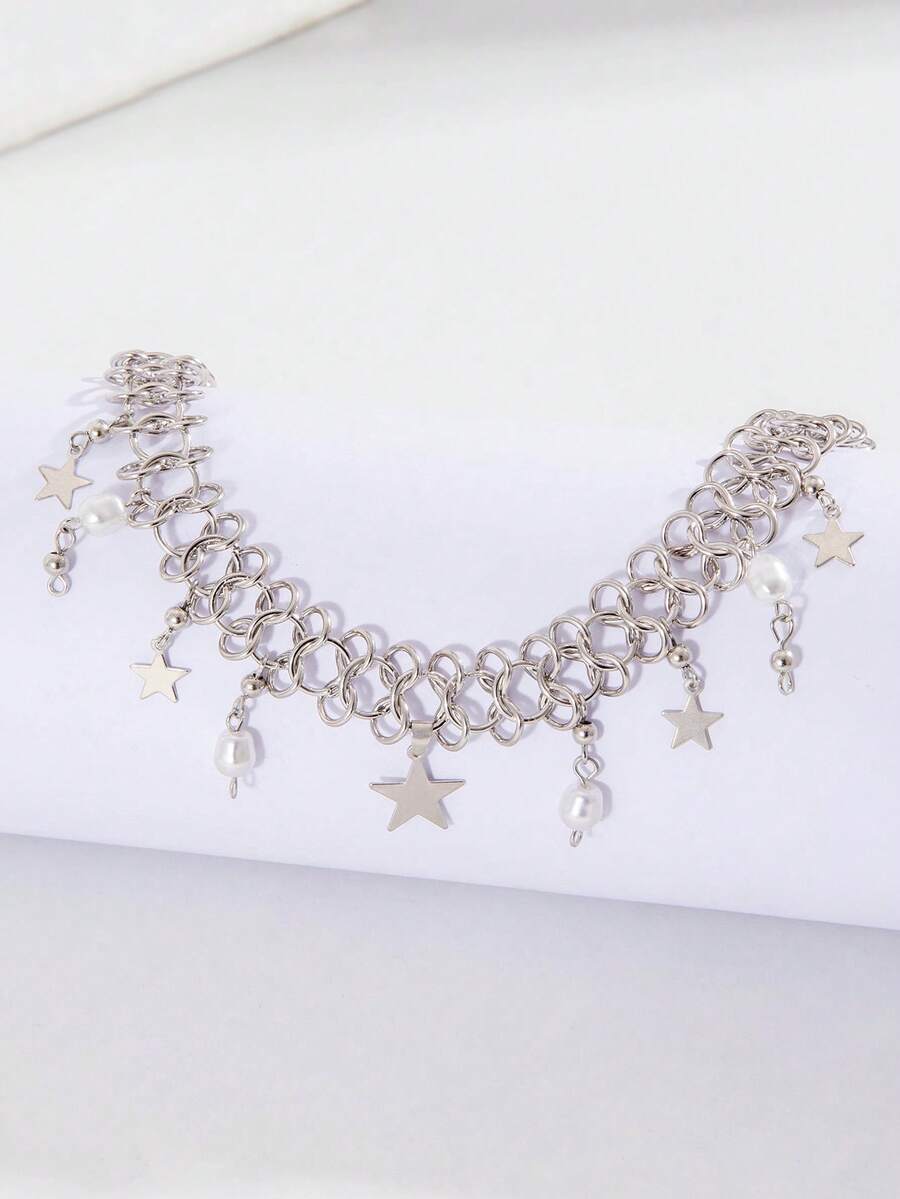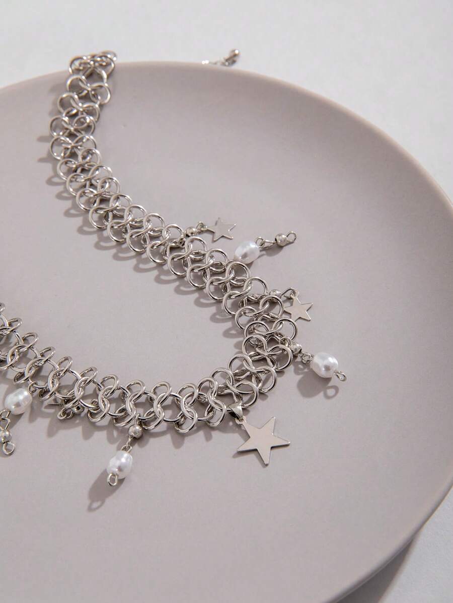 Grunge Punk 1pc Simple Yet Bold Pearl & Star Design Pendant Necklace, Great For Parties And Gift