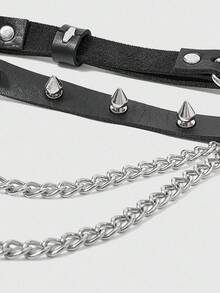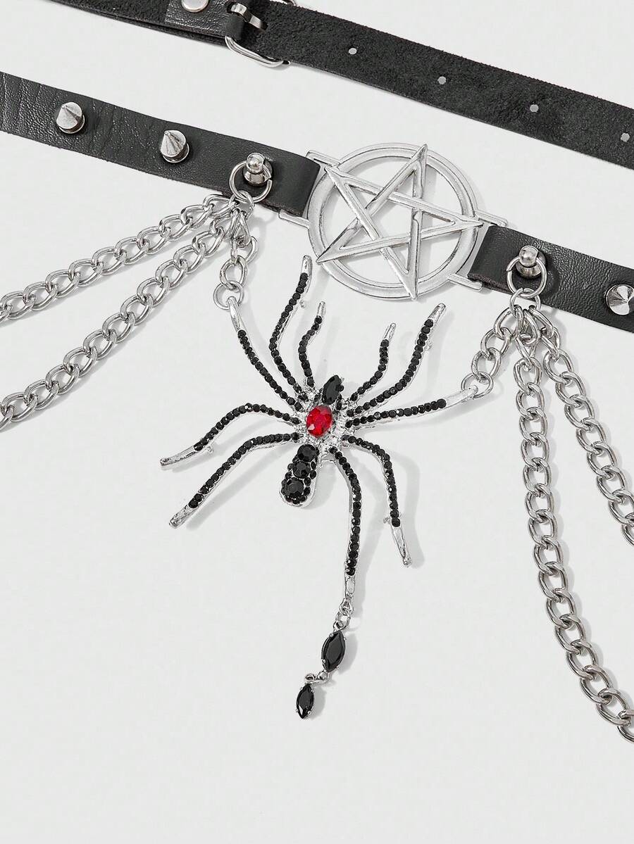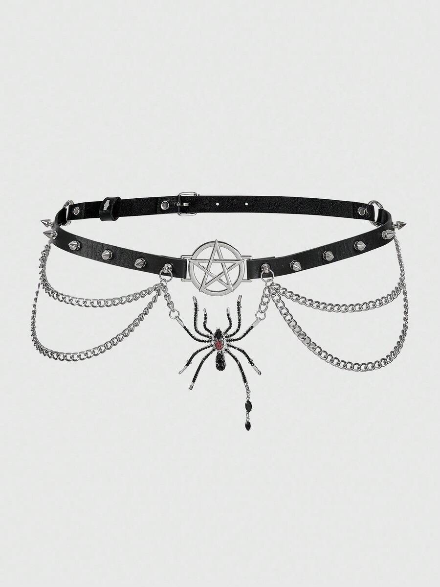 Grunge Punk 1pc Women's Black Spiked Double Chain Water Crystal Spider Decor Goth Waist Belt, Versatile Accessory For Halloween And Daily Wear