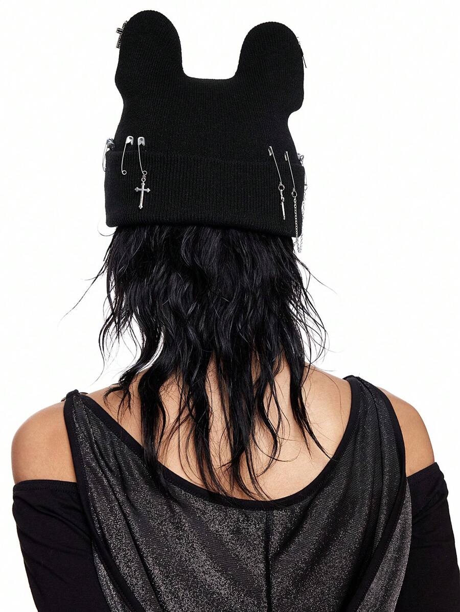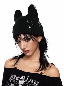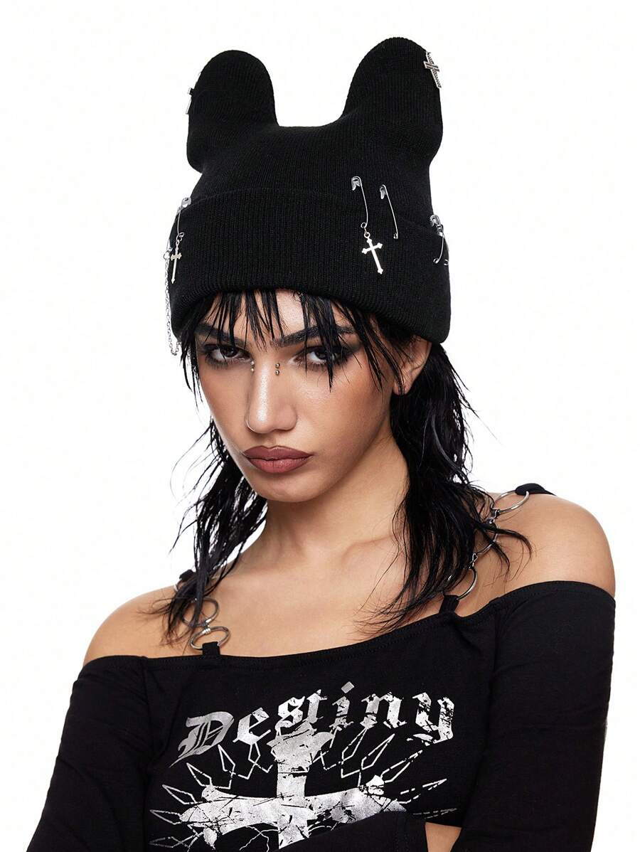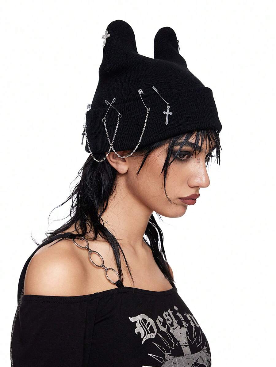 Grunge Punk 1pc Women's Cute, Basics, Y2K, Street Style, Textured, Knit, Cross Design Buckle Beanie Hat, Suitable For Casual, School Wear, Winter