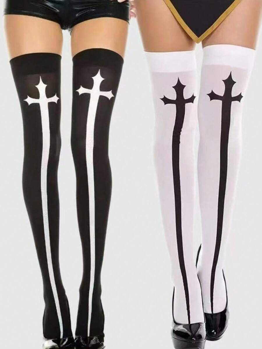 Grunge Punk 2 Pairs Combination Set Cross Design Sexy Thigh High Socks For Women, Halloween