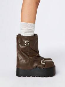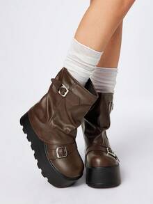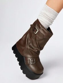 Grunge Punk 2025 Autumn/Winter New Round Toe Thick Sole Punk Style Buckle Design Leg Boots, Leather Outdoor Fashion Slip-On Short Boots