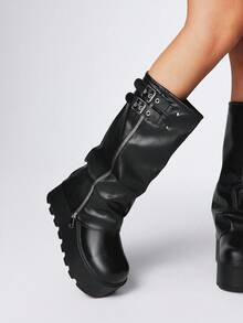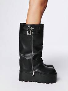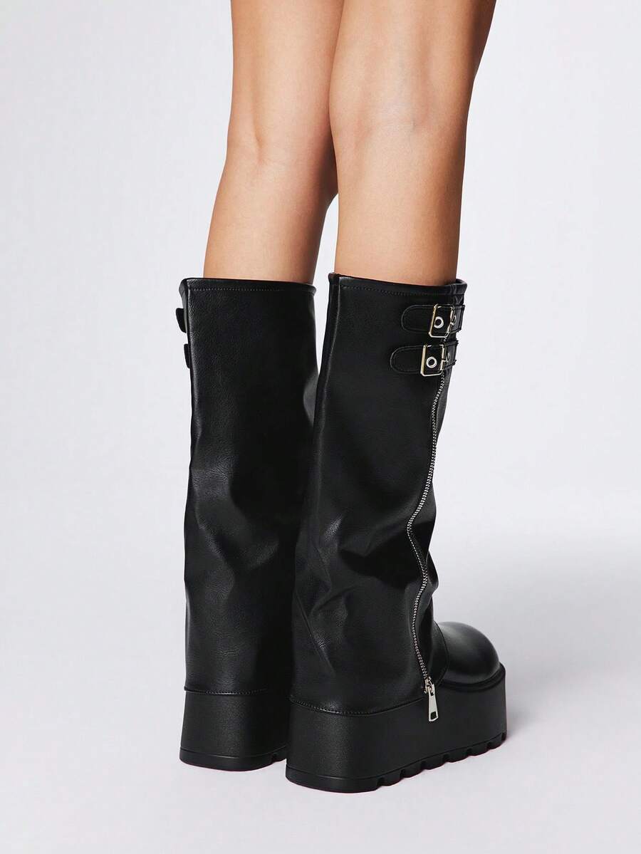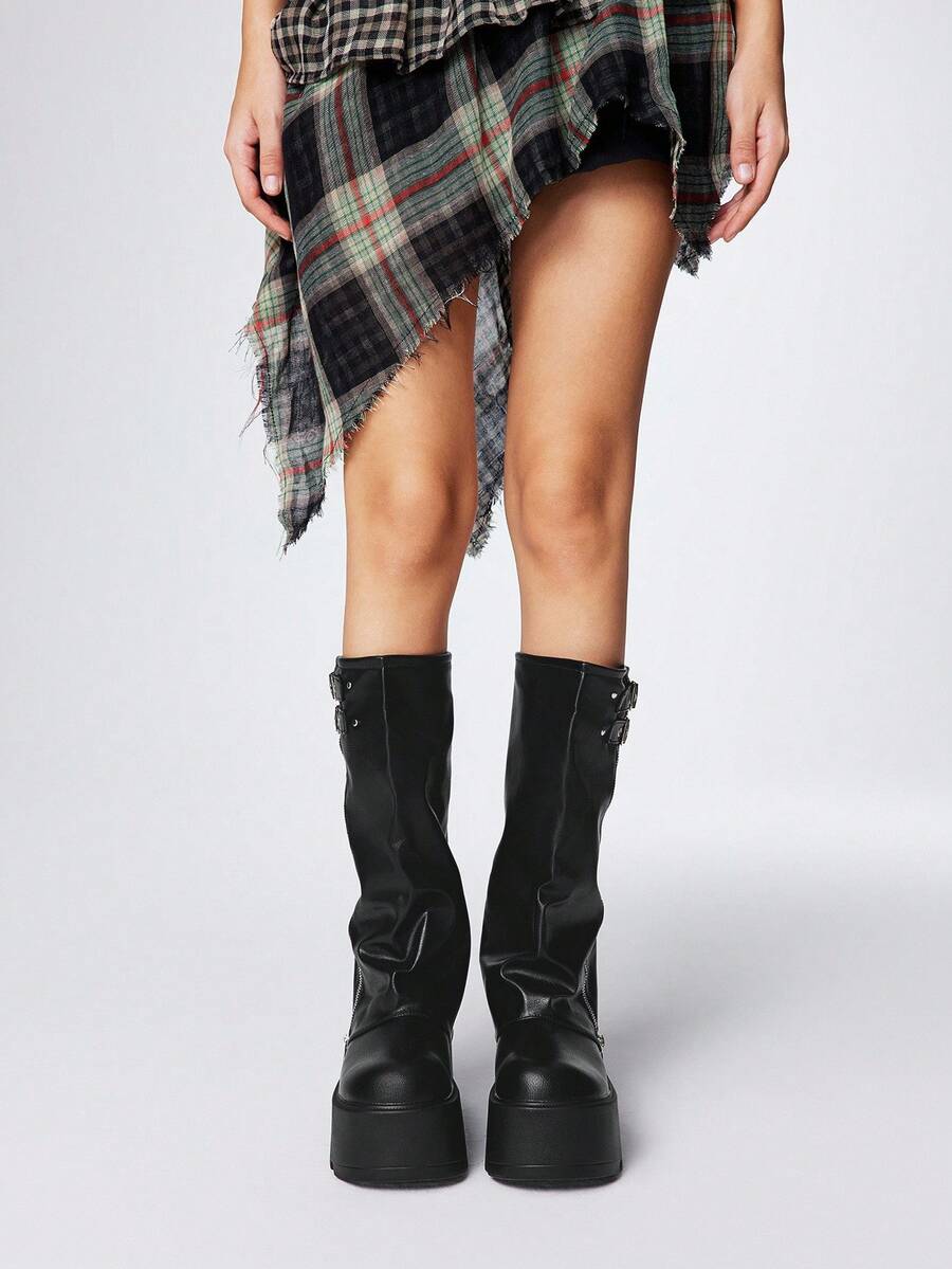 Grunge Punk 2025 Autumn/Winter New Round Toe Thick Sole Punk Style Buckle Zipper Design Pants Leg Boots, Leather Outdoor Fashion Slip-On Mid-Calf Boots