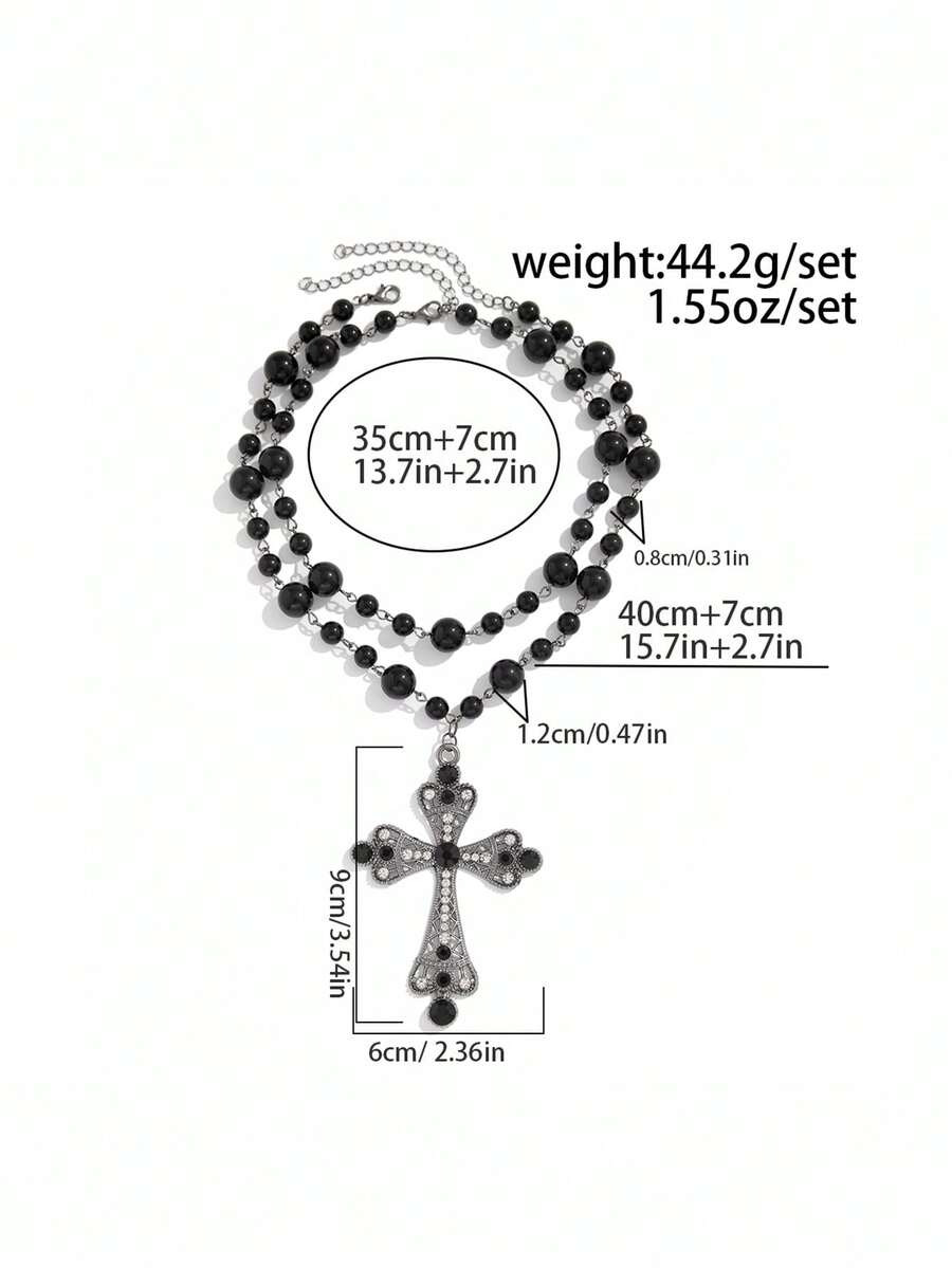 Grunge Punk 2pcs Cross Pendant & Beaded Necklace Set