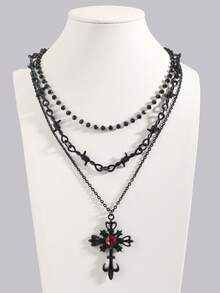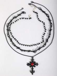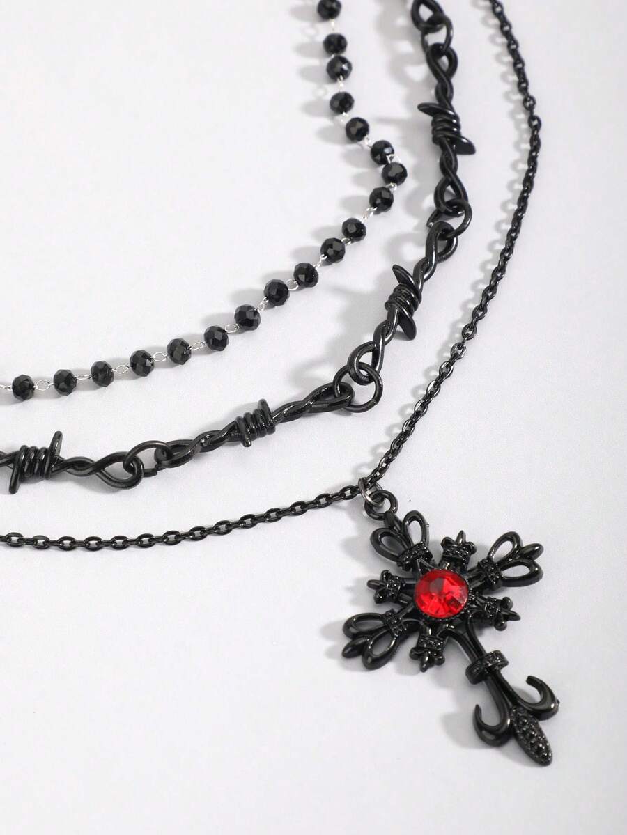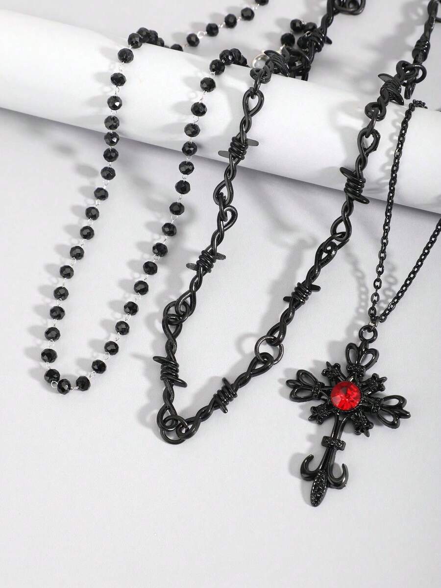 Grunge Punk 3pcs Gothic Style Black Beaded, Red Thorn Rose, Cross & Heart Pendant Necklace Set For Women