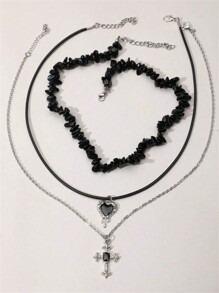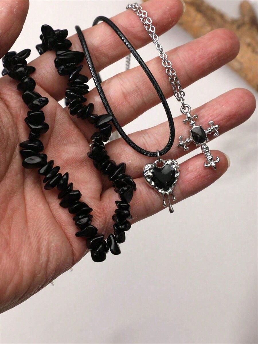 Grunge Punk 3pcs/Set Fashion Black Stone Heart Cross Pendant Necklace Set For Women