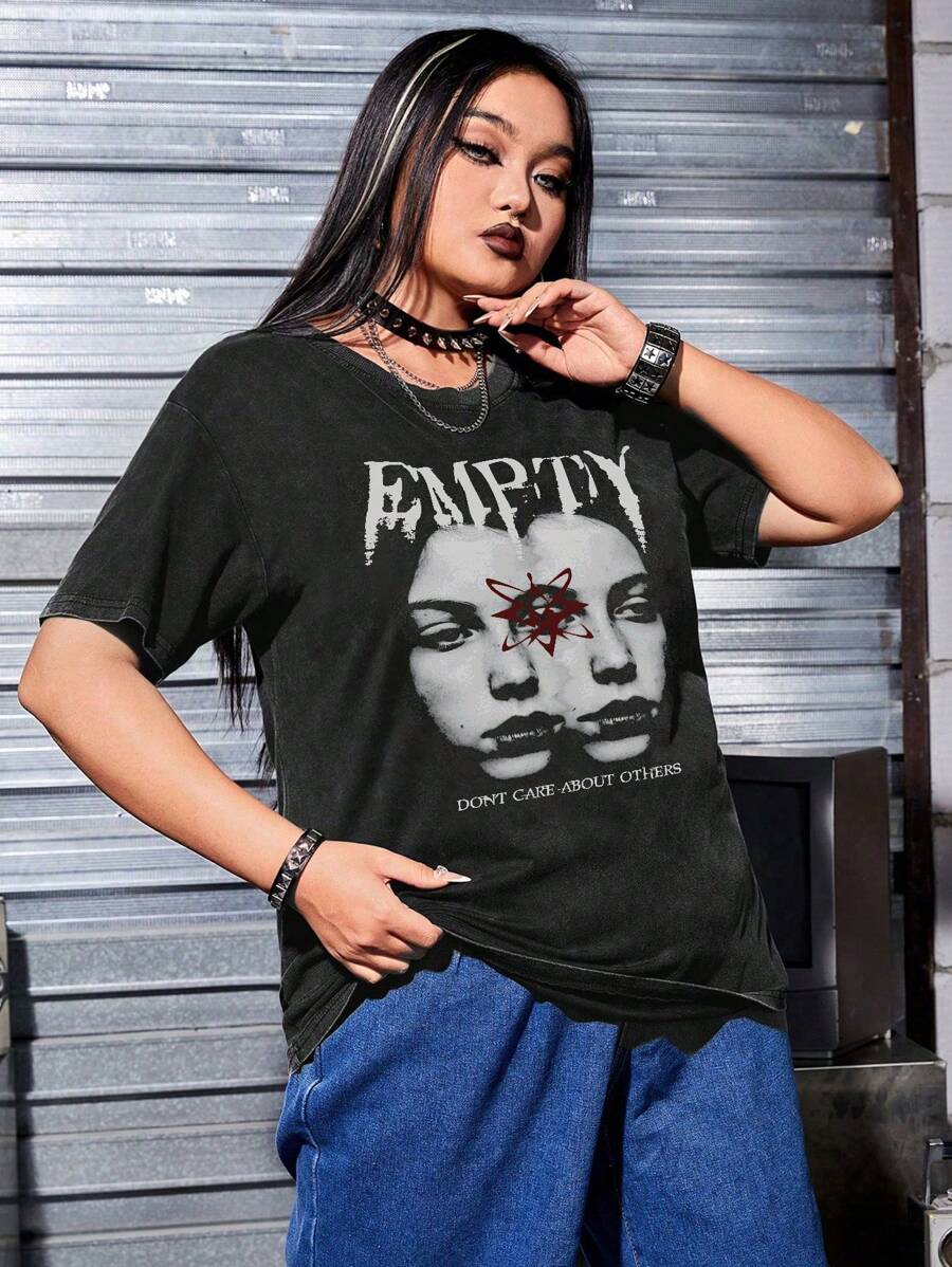 Grunge Punk Abi Nihilism Couple Face Printed Snow Washed Plus Size T-Shirt