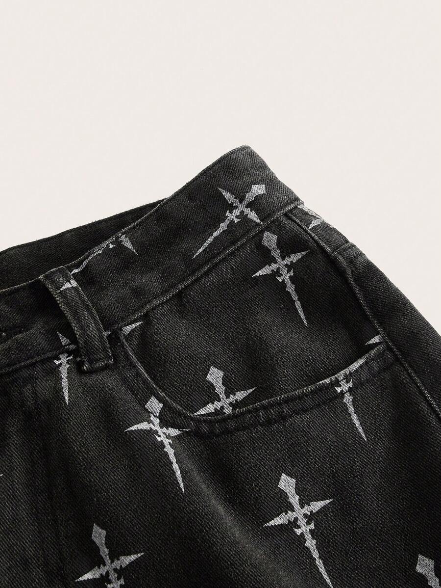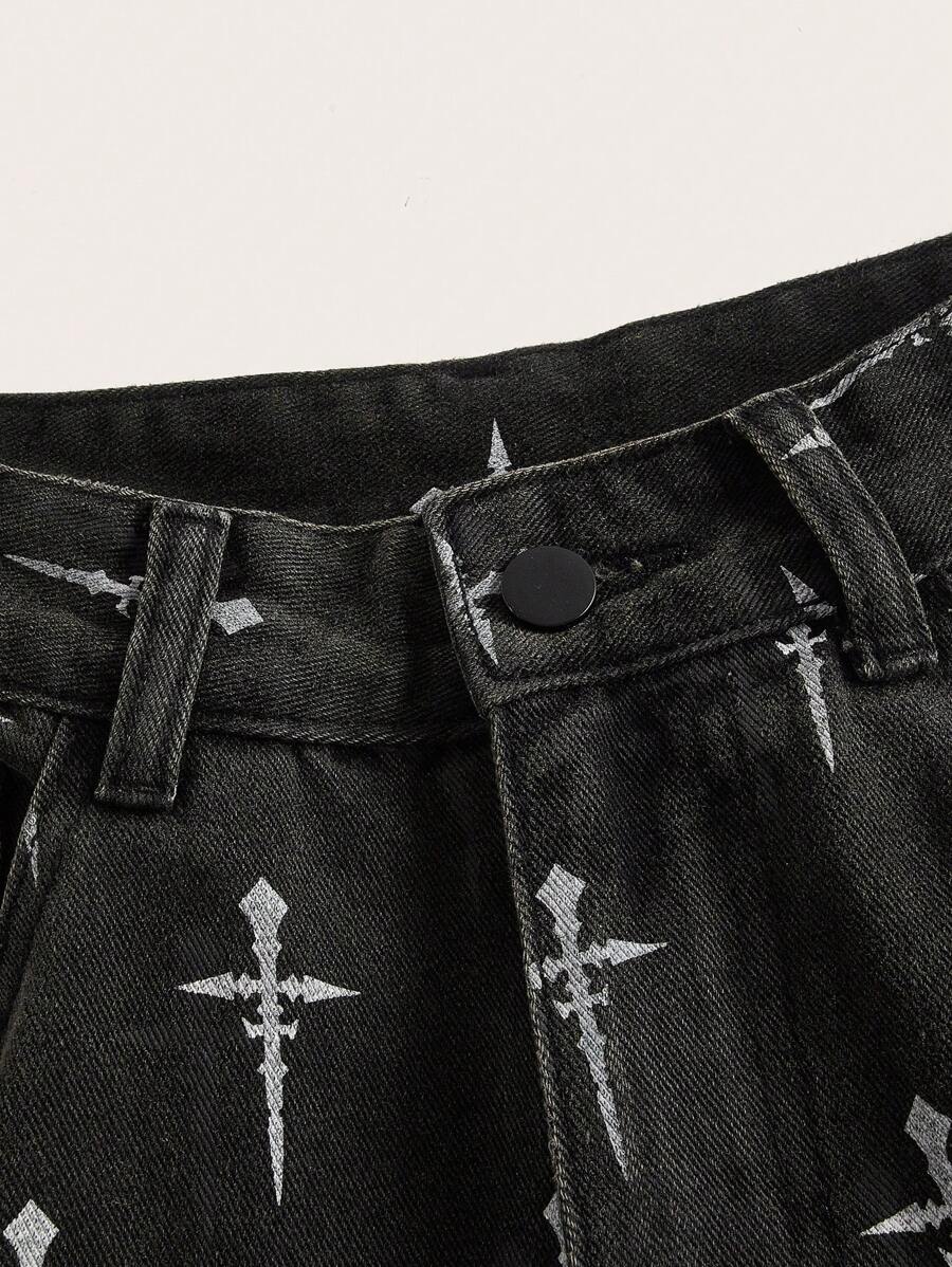 Grunge Punk Allover Cross Print Straight Leg Jeans