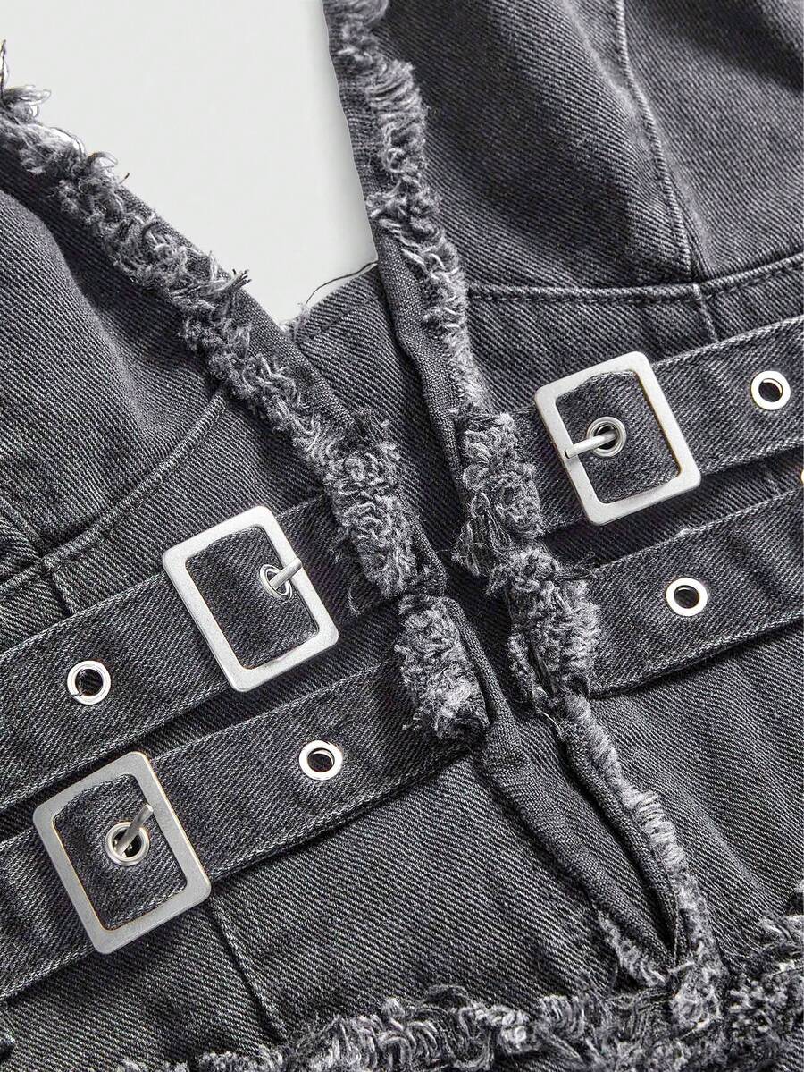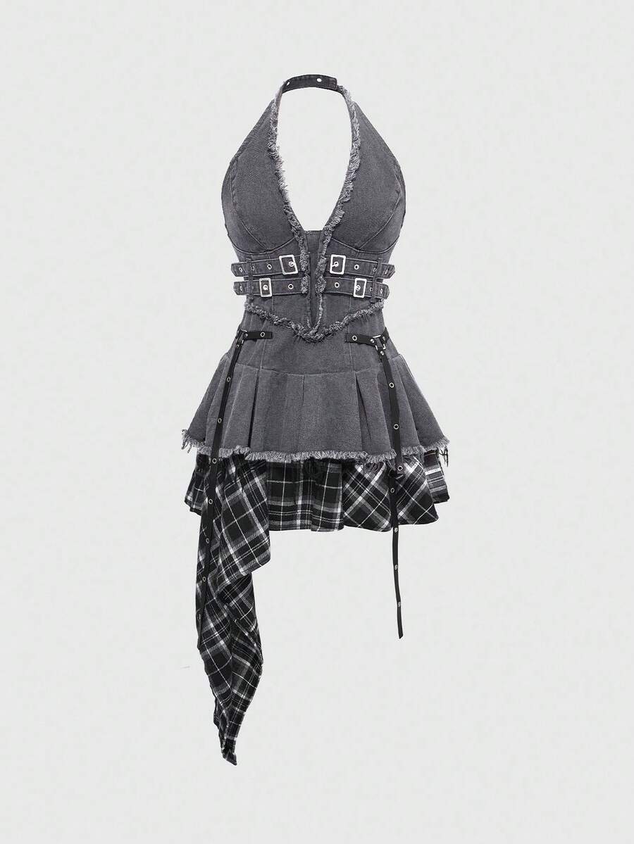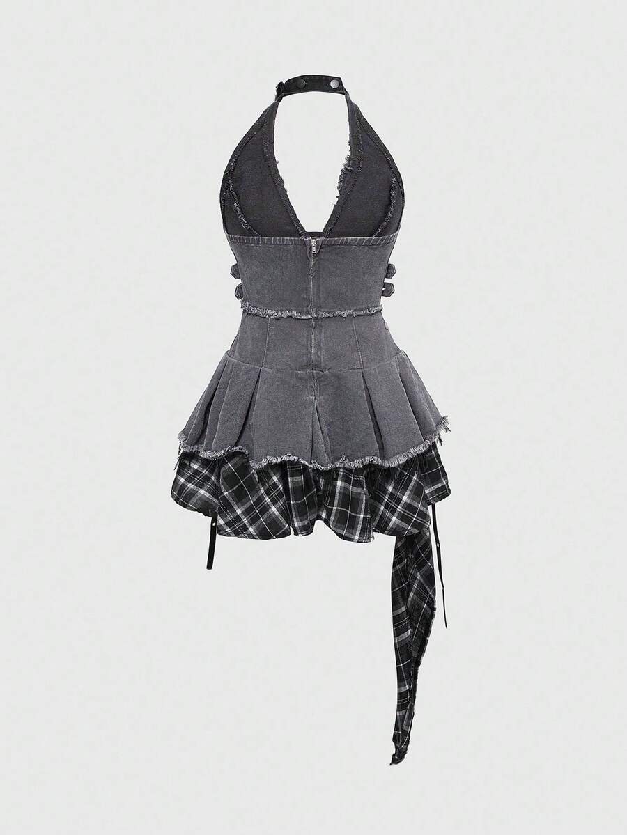 Grunge Punk Asymmetrical Hem Frayed Denim Patchwork Plaid Halter Neck Denim Dress