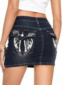 Grunge Punk Casual College Style Street Wings Printed Denim Skirt With Pockets, Summer