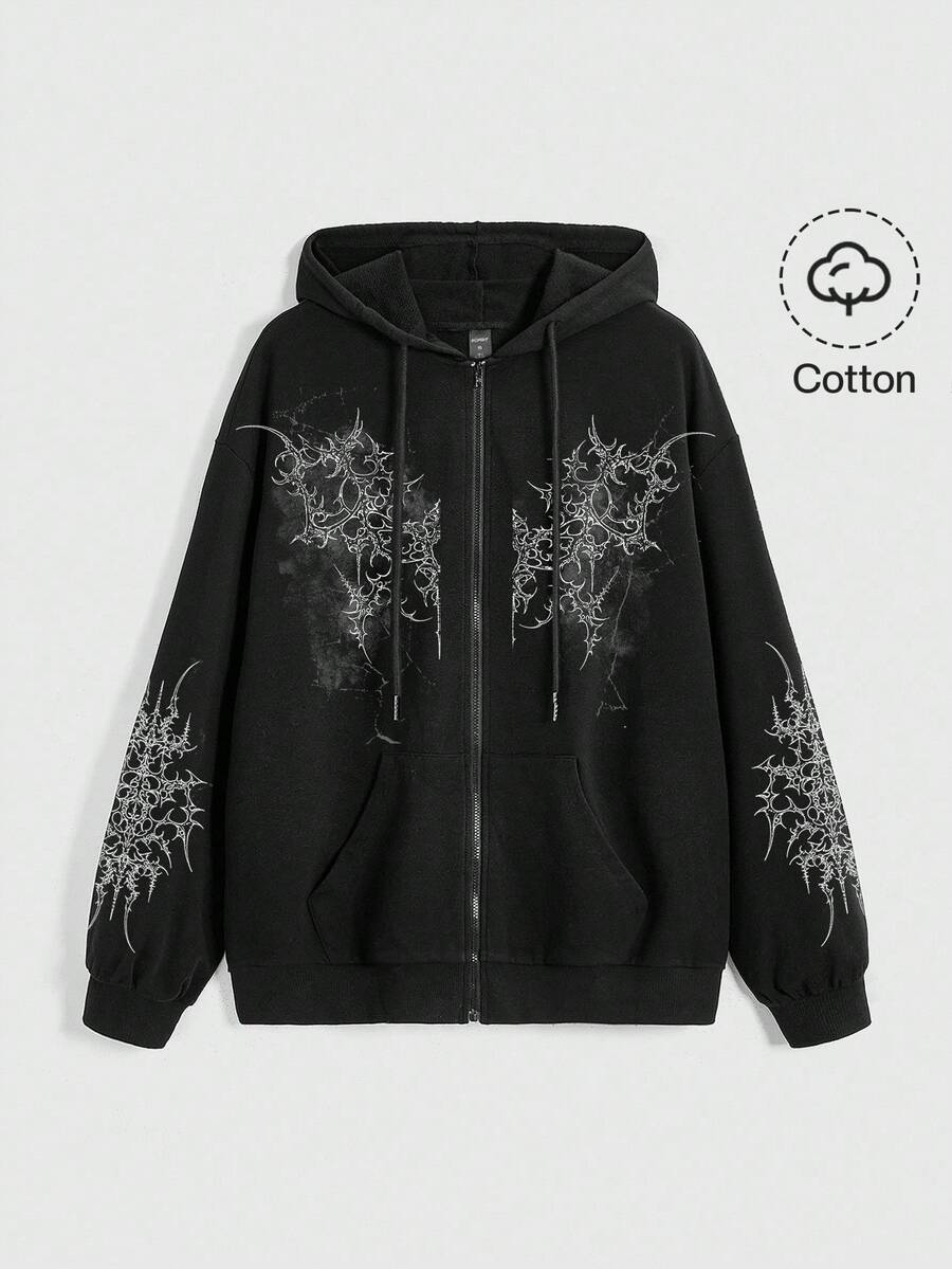 Grunge Punk Casual Graphic Black Punk Street Chic Vintage Thorns Y2K Y3K Futuristic Tie-Dye Cross Print Black Zip-Up Graphic Pocket Sweatshirt For Women