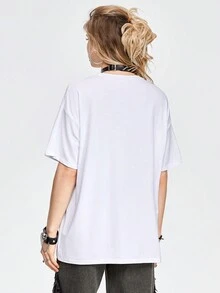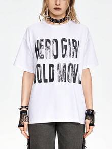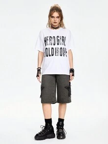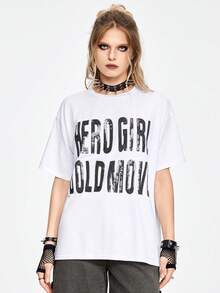 Grunge Punk Casual Loose Solid Color Women's T-Shirt With Cool Miss Word Letter Sequin Embroidery
