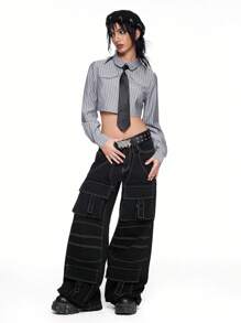Grunge Punk Casual Versatile College Style Fine Striped Woven Detachable Collar Long Sleeve Shirt