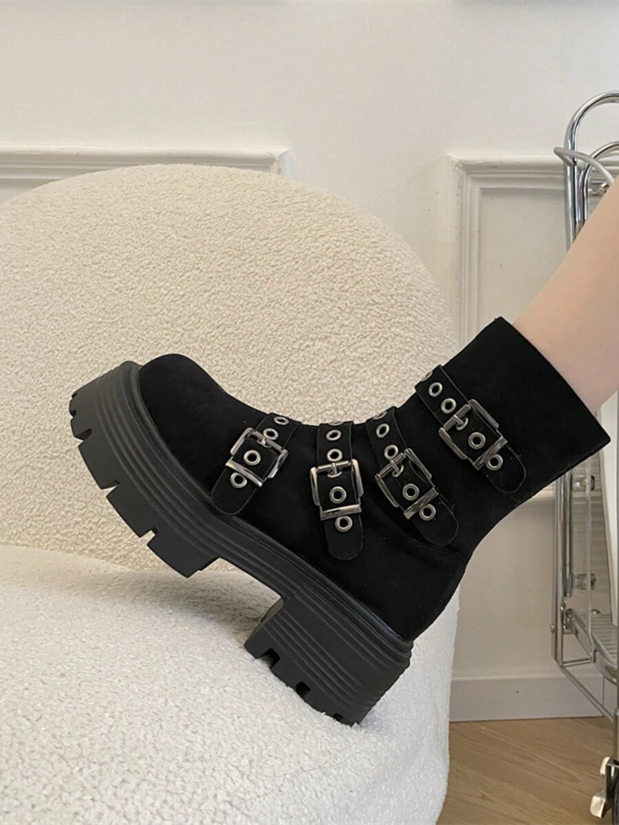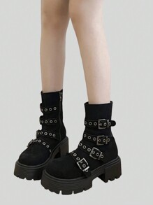 Grunge Punk Chunky Heel Boots Women's British Style Spring Black High Heel Booties With Side Zipper, Suitable For Shorter Girls
