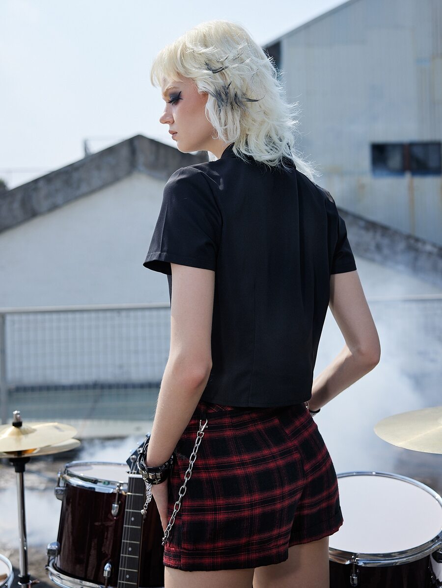 Grunge Punk Cross Print Cut Out Button Front Shirt & Neck Tie
