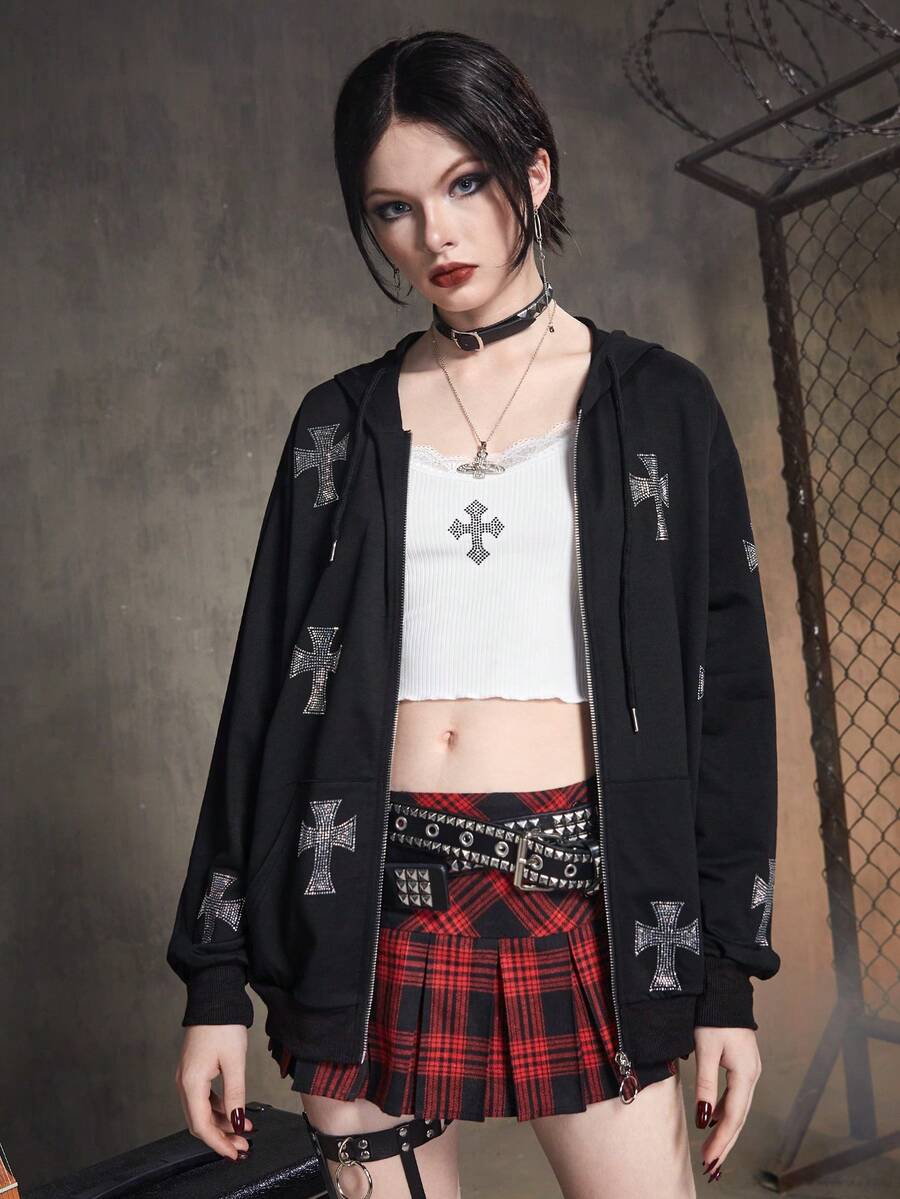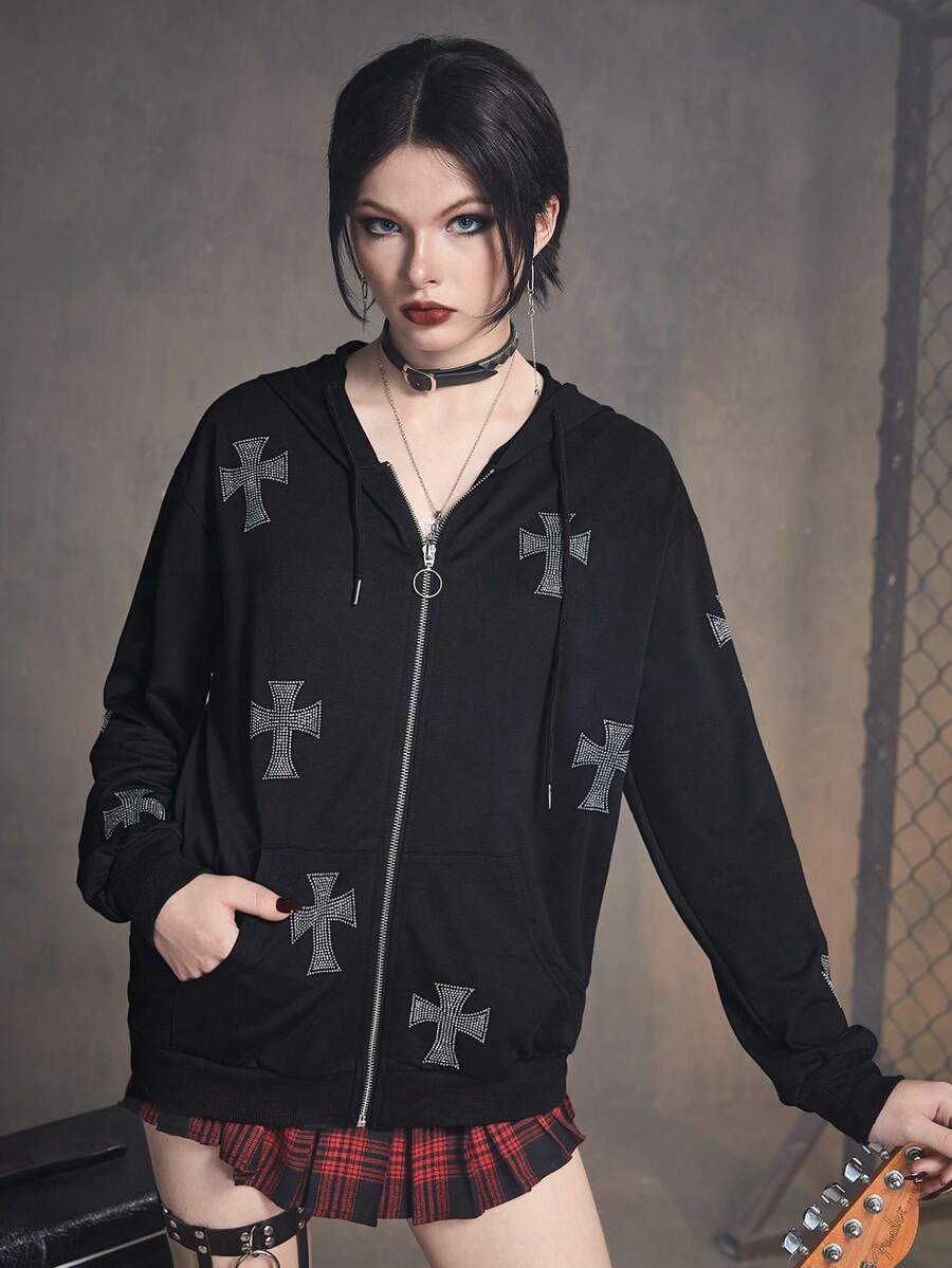 Grunge Punk Cross Rhinestone Zip Up Drawstring Hoodie