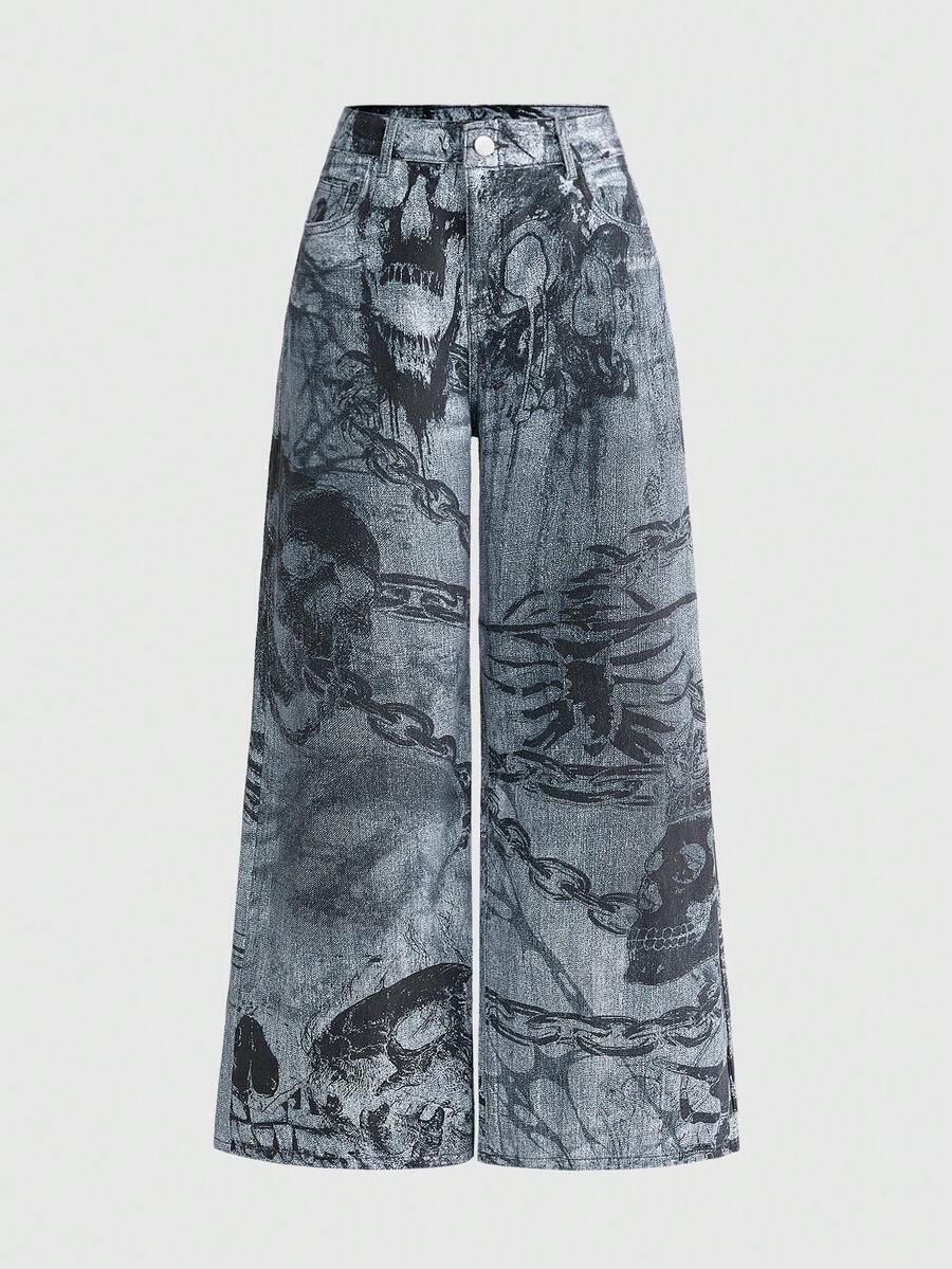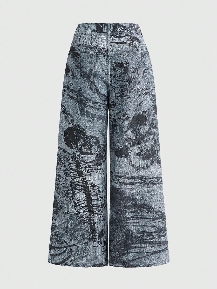 Grunge Punk Dark Gothic Skull Skeleton Chain Print Loose Wide-Leg Jeans