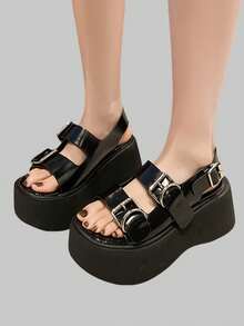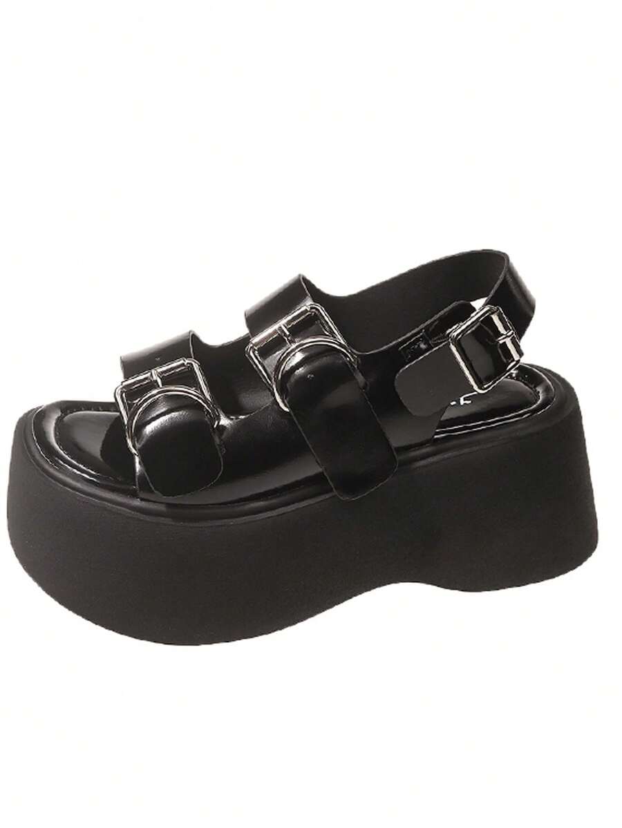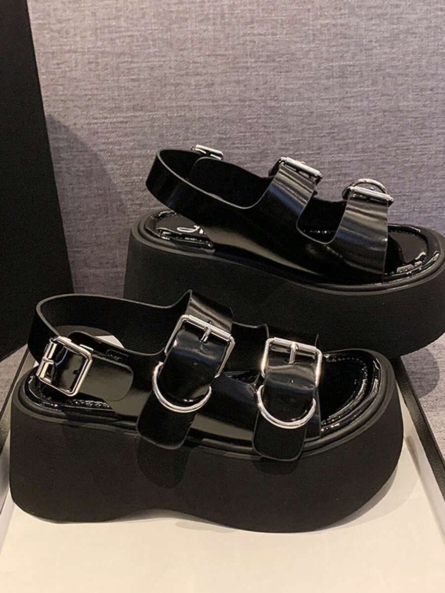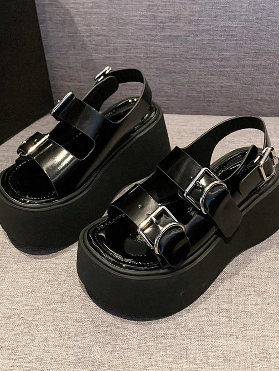 Grunge Punk Dark Punk Metal Belt Buckle Designed Thick-Soled Versatile Fashion Sandals With Open Toe And Roman Straps