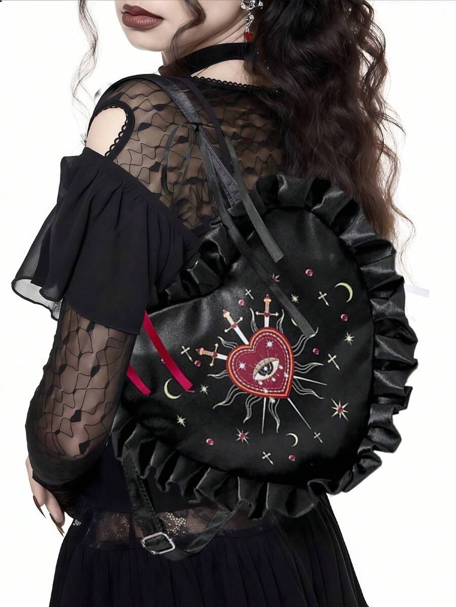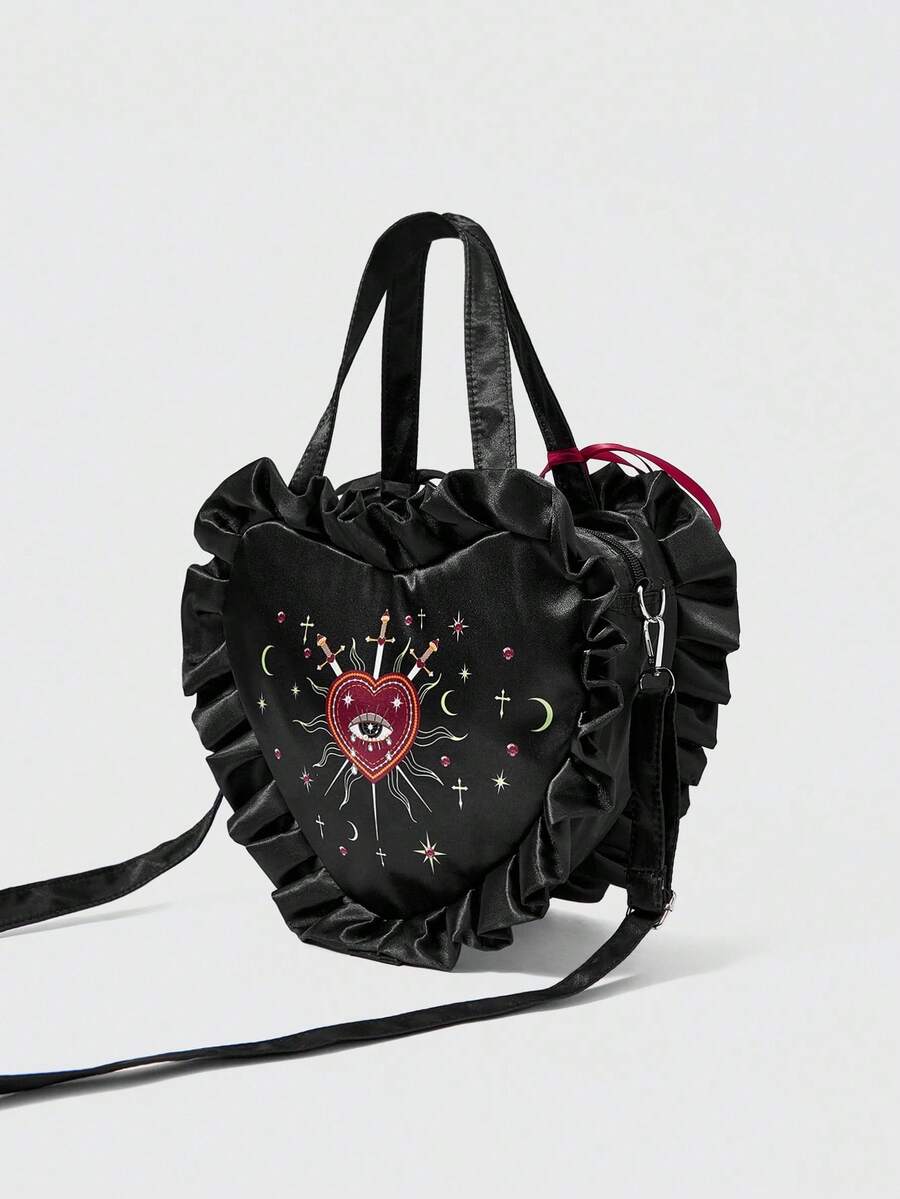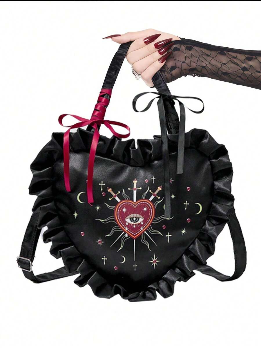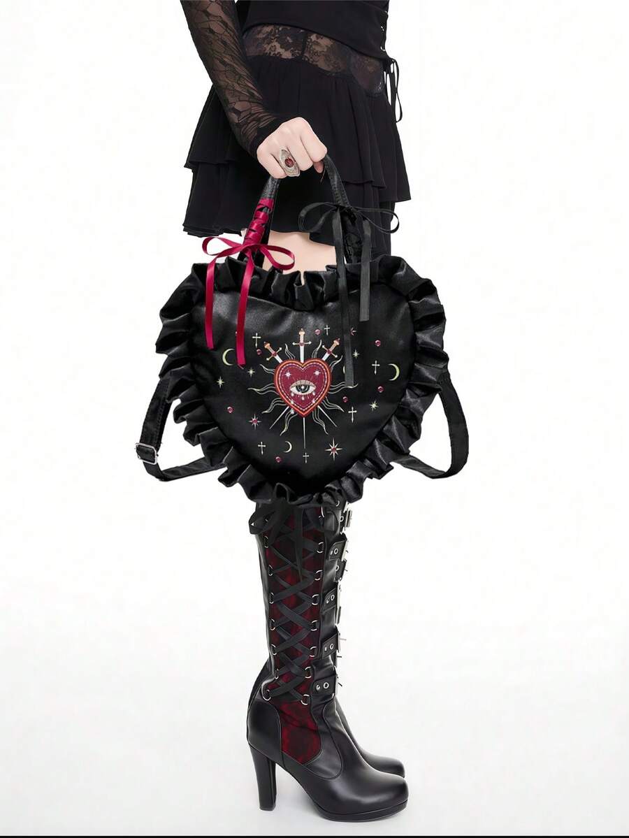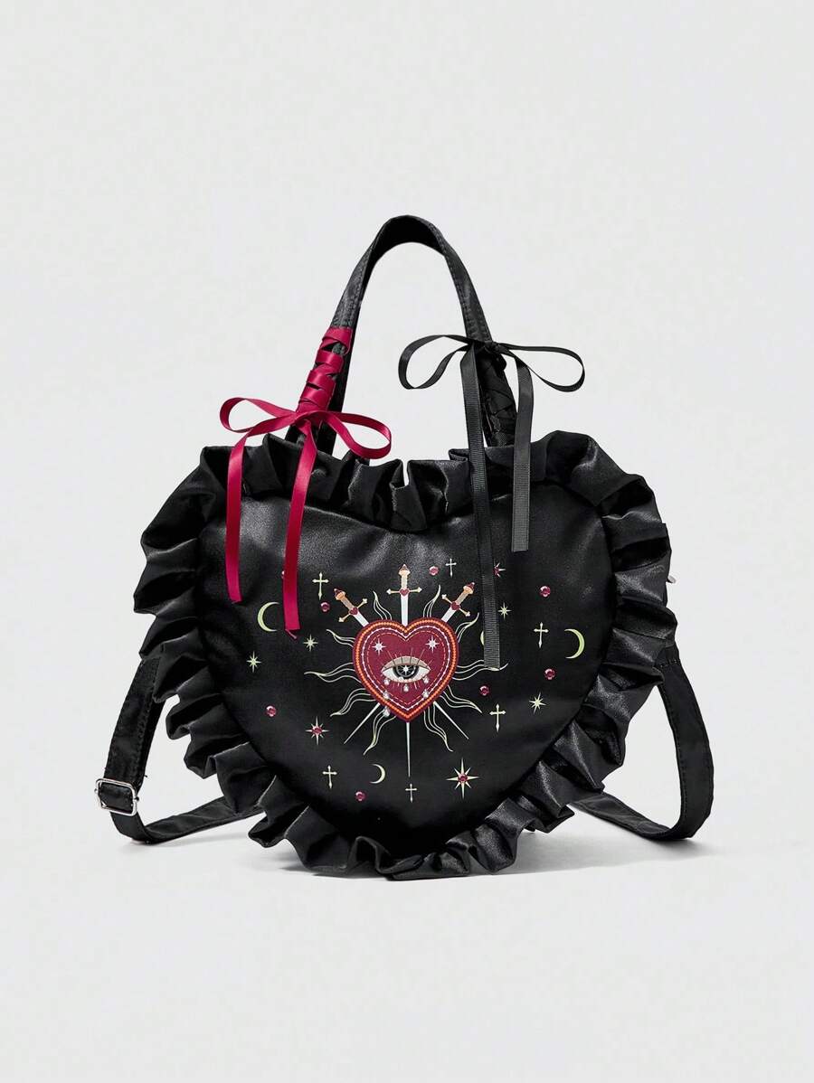 Grunge Punk Eyeball, Heart, Star & Gem Pattern Heart Shaped Handbag, Lace Decor, Large Capacity Tote Bag, For Women, Shoulder Bag, Style No. 1337053