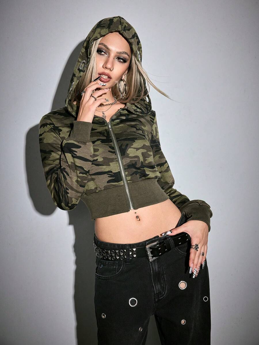 Grunge Punk Fashionable Camouflage Hoodie With Metal Eyelets For Women, Cropped Long Sleeve Sweatshirt