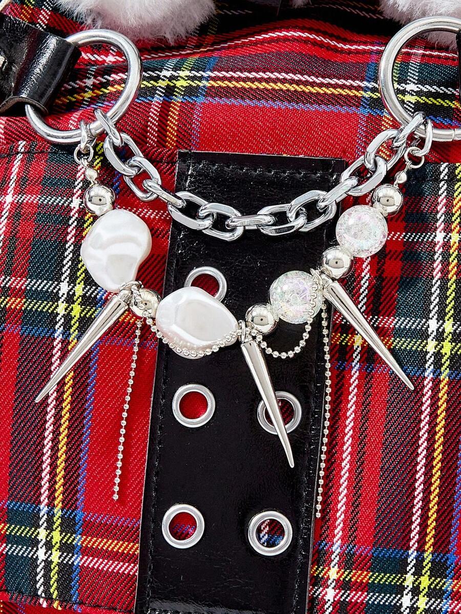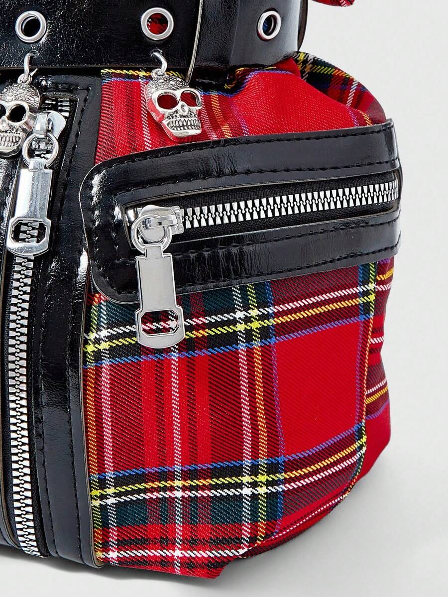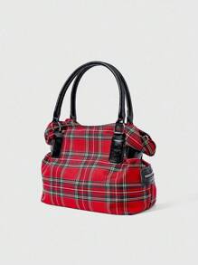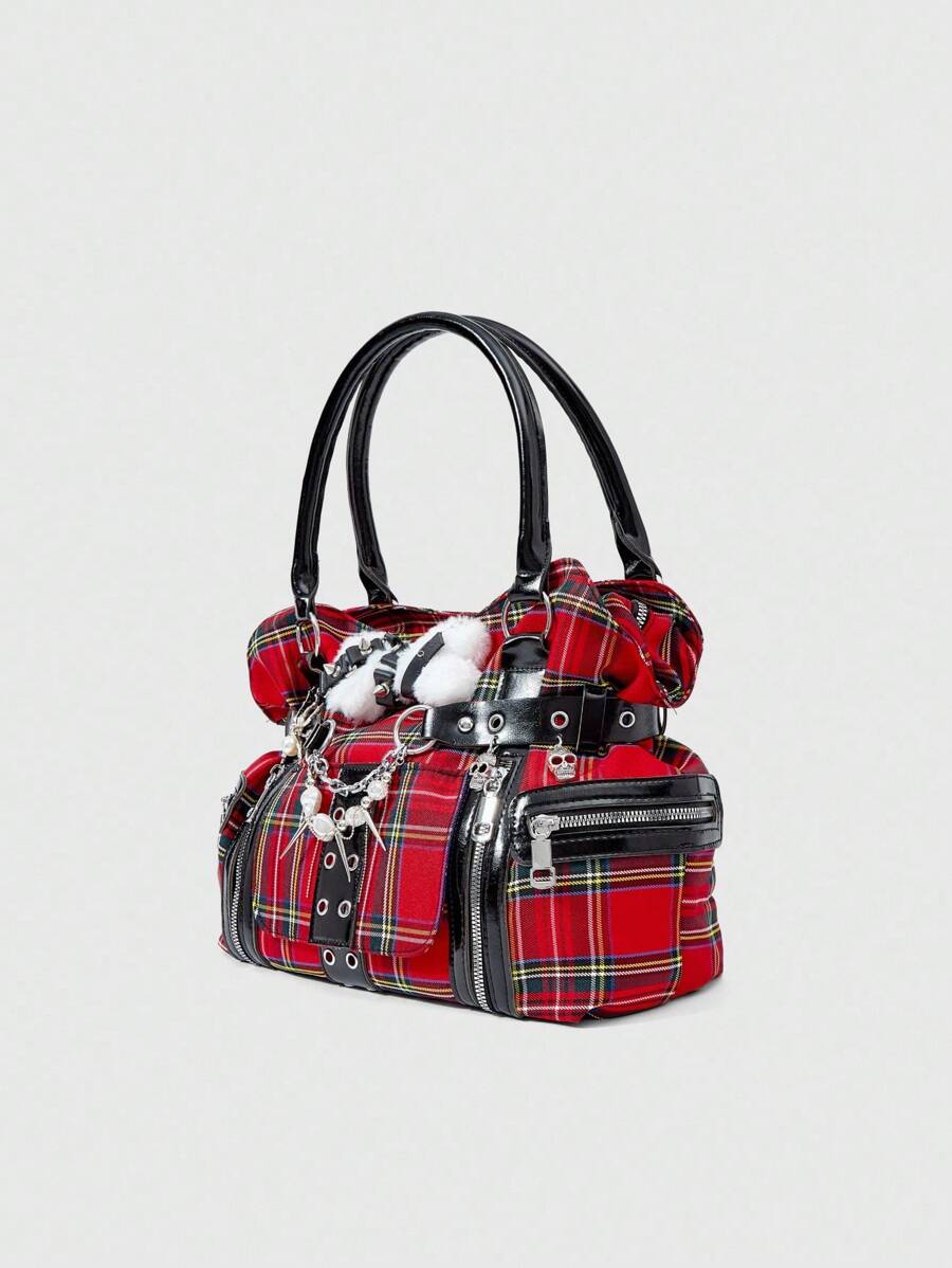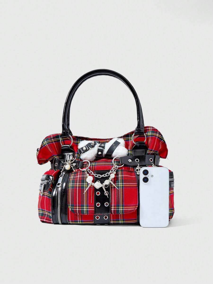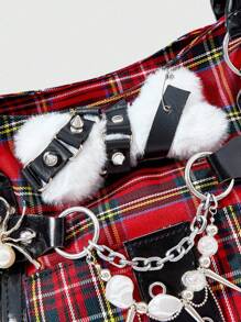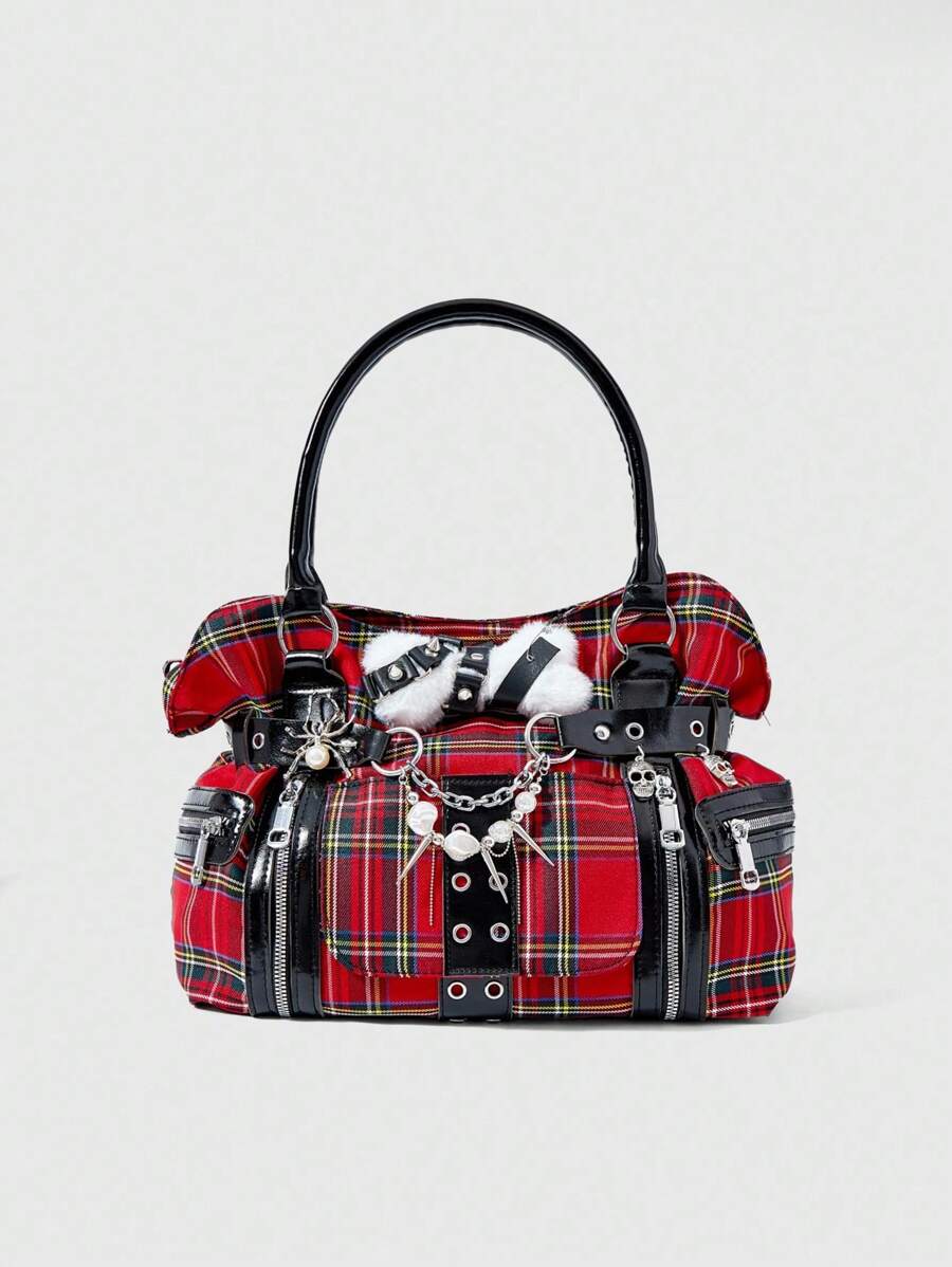 Grunge Punk Fashionable Y2K Plaid Spider & Skull Decor Tote Bag, Halloween, Halloween Bags Perfect For Fancy Party Matching With Halloween Costumes