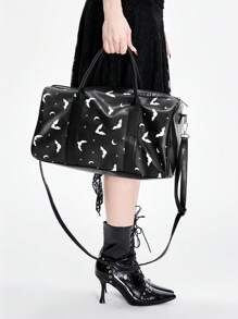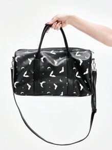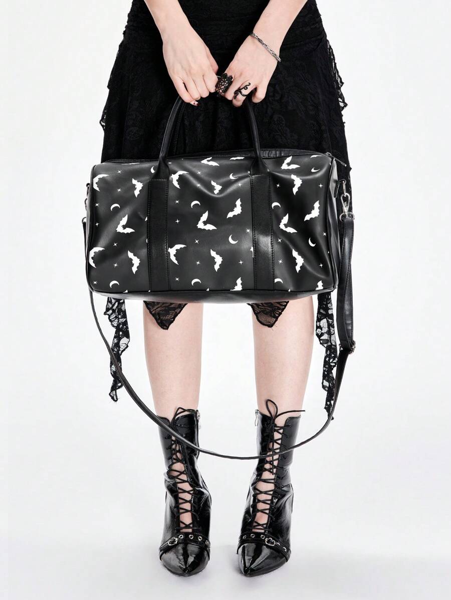 Grunge Punk Faux Leather Bat Print Travel Duffle Bag, Halloween