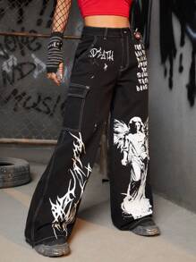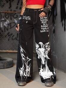Grunge Punk Figure & Slogan Graphic Wide Leg Jeans