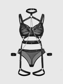 Grunge Punk Gothic Punk Metal Chain Underwire Bustier, Garter Belt And G-String 3-Piece Sexy Lingerie Set