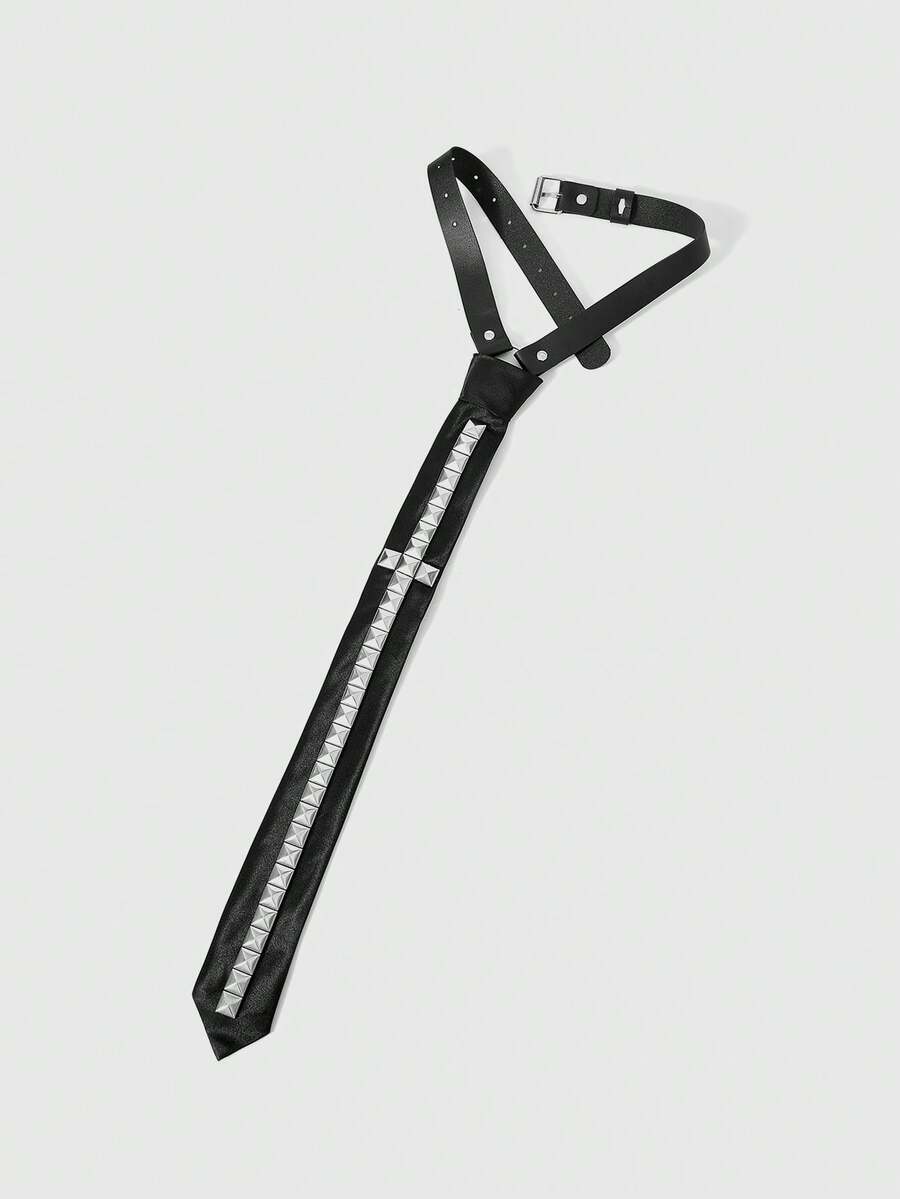 Grunge Punk Gothic & Trash Rock Collar Tie - Y2K Fashion Black Leather Strap Gold Tower Rivet Cross Tie For Men And Women, Alternative Streetwear, Concerts And Carnival Parties