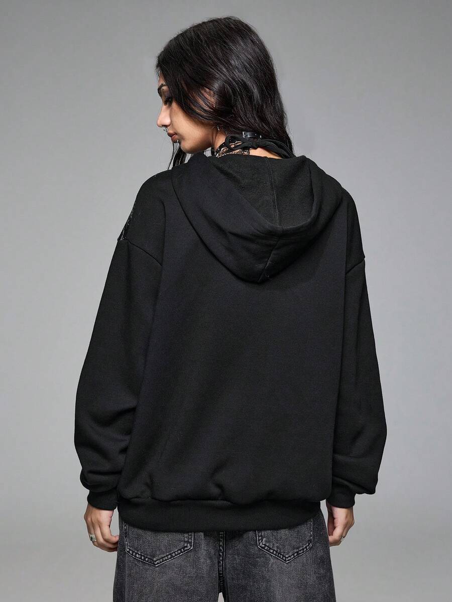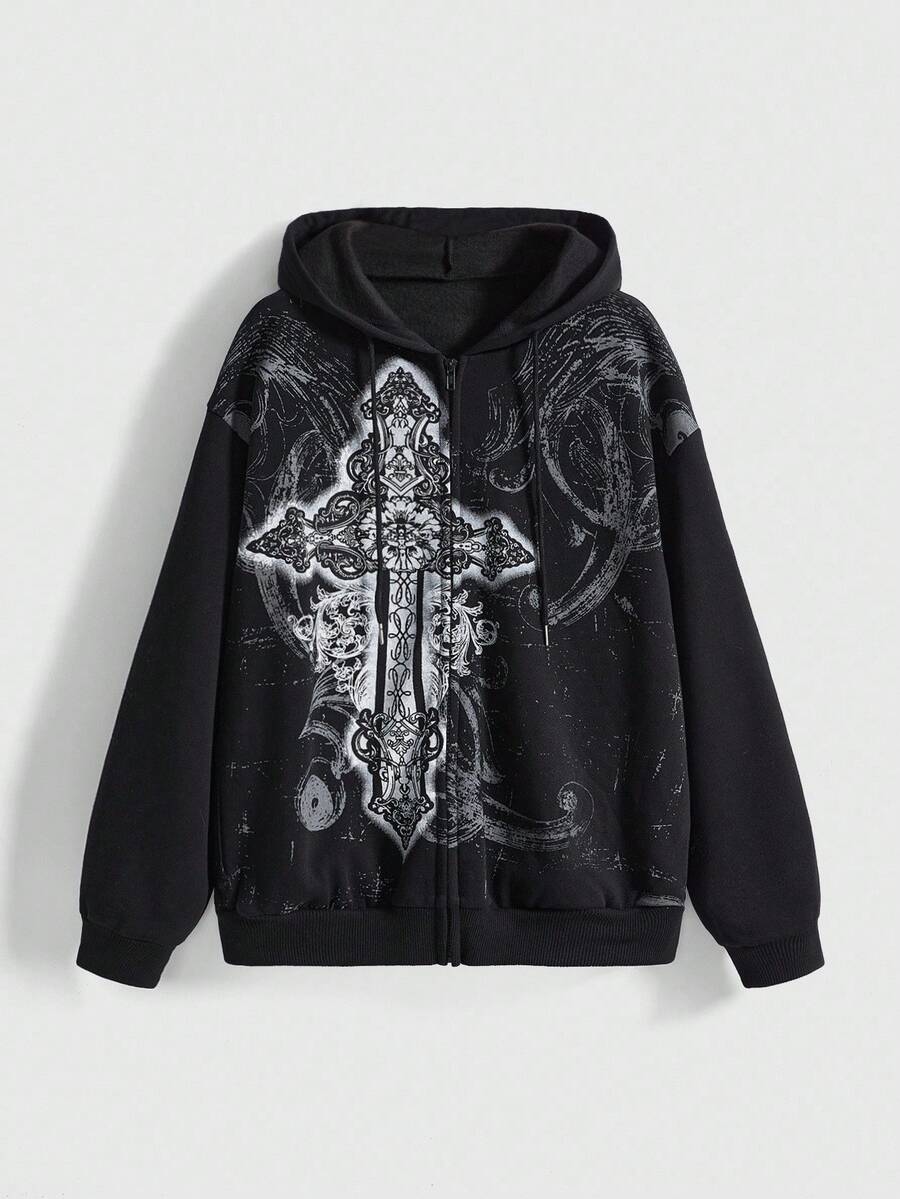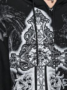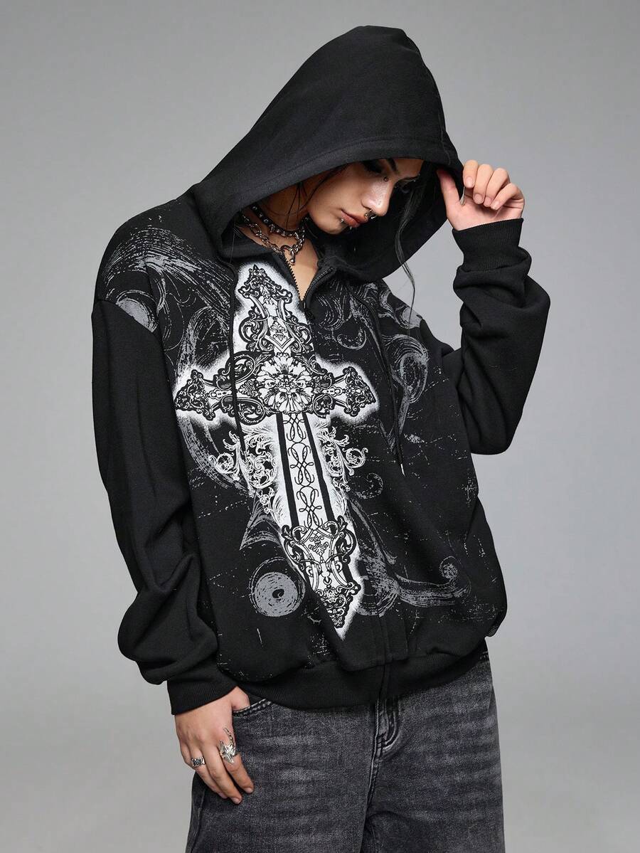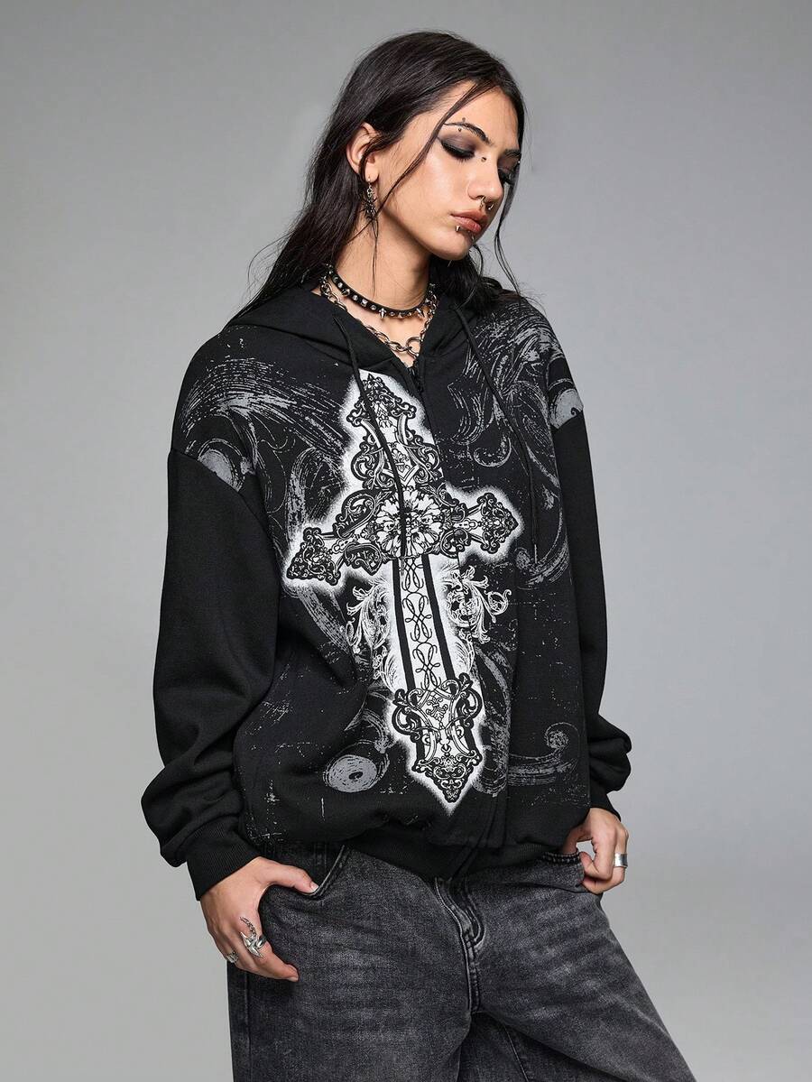 Grunge Punk Grunge Style Cross Pattern Print Loose Fit Hoodie For Women