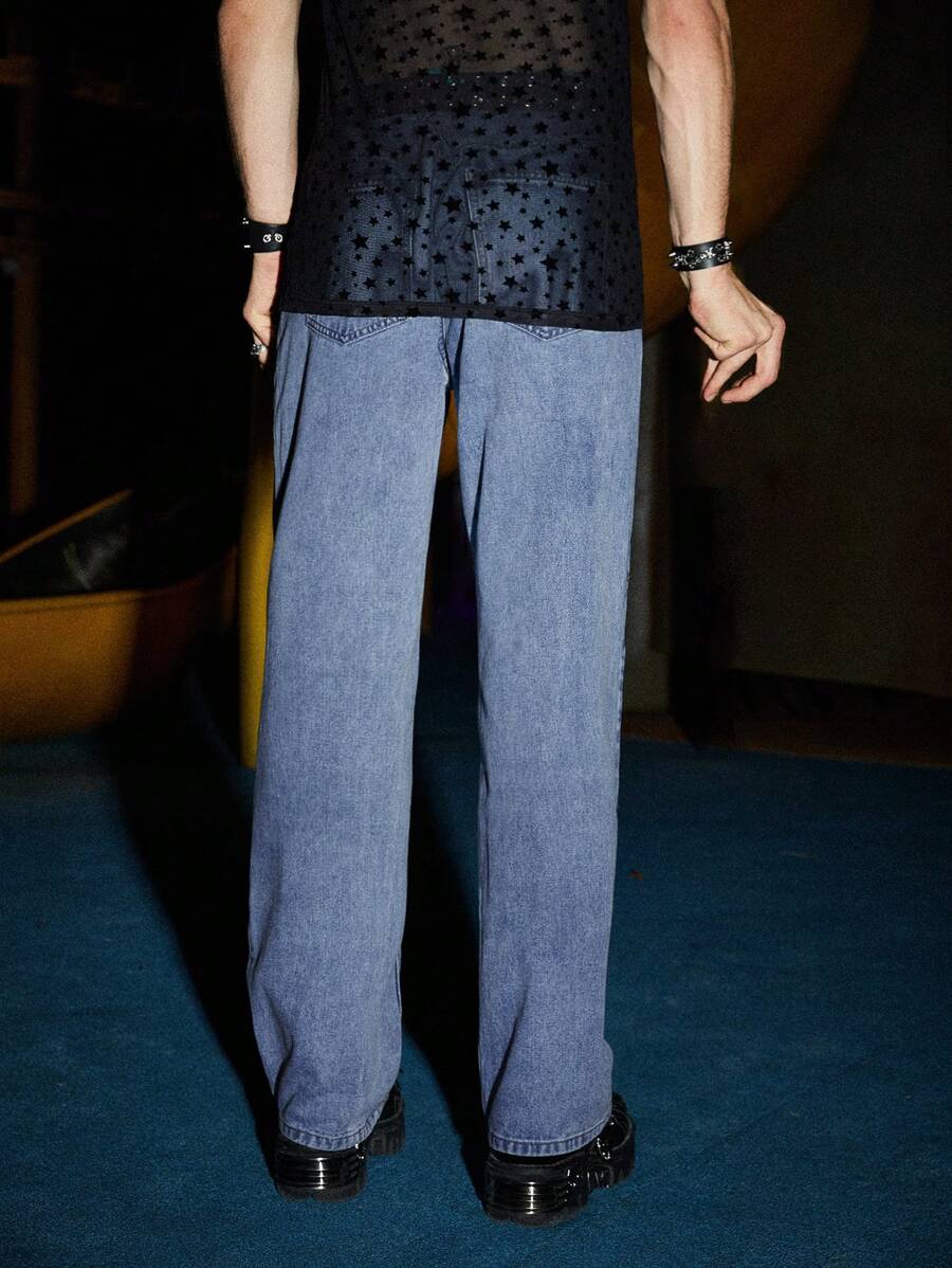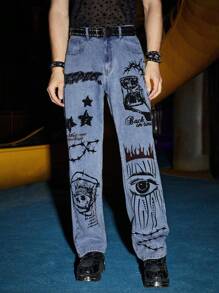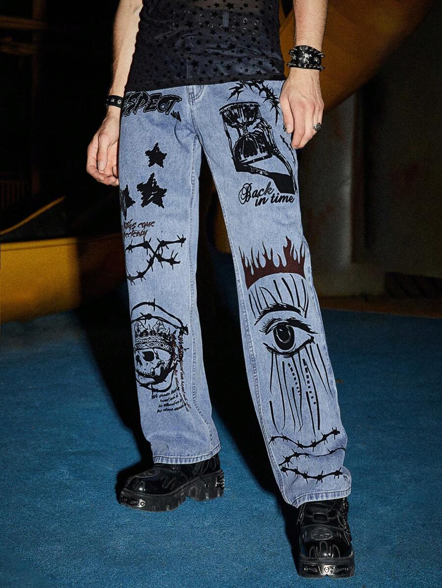 Grunge Punk Guys Cotton Figure Graphic Straight Leg Jeans